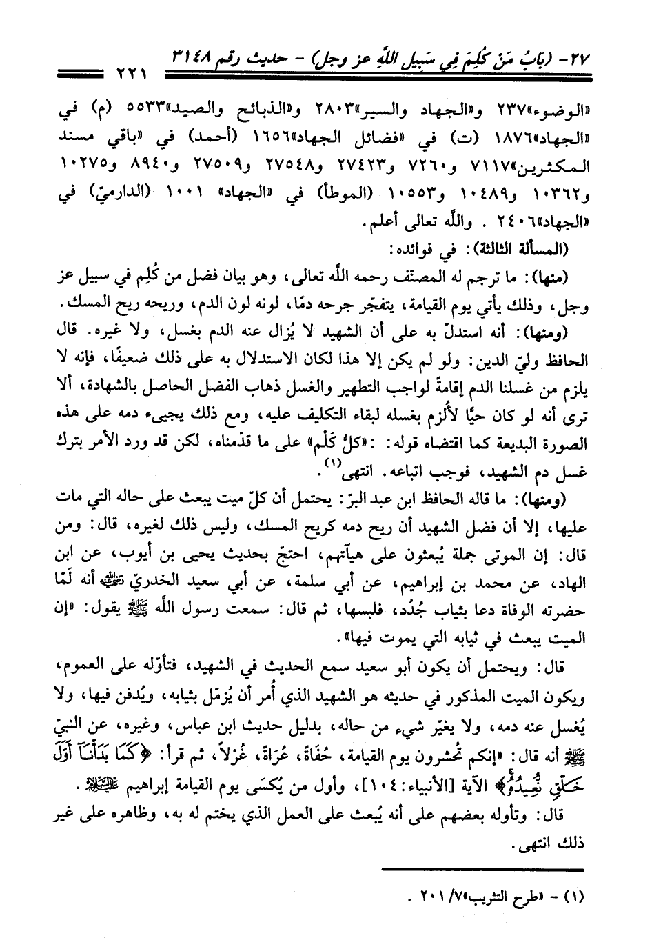 (منها): ما ترجم له المصنّف -رحمه اللَّه تعالى-، وهو بيان فضل من كُلِم في سبيل اللَّه -عَزَّ وَجَلَّ-، وذلك يأتي يوم القيامة، يتفجّر جرحه دمًا، لونه لون الدم، وريحه ريح المسك. (ومنها): أنه استدلّ به على أن الشهيد لا يُزال عنه الدم بغسل، ولا غيره. قال الحافظ وليّ الدين: ولو لم يكن إلا هذا لكان الاستدلال به على ذلك ضعيفًا، فإنه لا يلزم من غسلنا الدم إقامةً لواجب التطهير والغسل ذهاب الفضل الحاصل بالشهادة، ألا ترى أنه لو كان حيًّا لأُلزم بغسله لبقاء التكليف عليه، ومع ذلك يجيىء دمه على هذه الصورة البديعة كما اقتضاه قوله: "كلُّ كَلْم" على ما قدّمناه، لكن قد ورد الأمر بترك غسل دم الشهيد، فوجب اتباعه. انتهى (¬1).