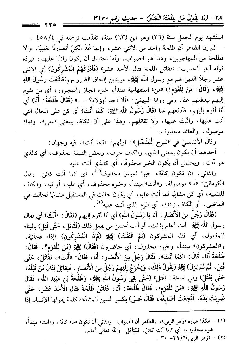 ثم إن الظاهر أن طلحة واحد من الاثني عشر، وإنما عُدَّ الكلُّ أنصاريًّا تغليبًا، وإلا فطلحة من المهاجرين، وهذا هو الصواب، وأما احتمال أن يكون زائدًا عليهم، فيردّه قوله آخر الحديث: "فقاتل طلحة قتال الأحد عشر" (فَأَدْرَكَهُمُ الْمُشْرِكُونَ) أي الاثني عشر رجلاً الذين هم مع رسول اللَّه - صلى اللَّه عليه وسلم -، مريدين إلحاق الضرر بهم (فَالْتَفَتَ رَسُولُ اللَّهِ - صلى اللَّه عليه وسلم -، وَقَالَ: مَنْ لِلْقَوْمِ؟) "من" استفهاميّة مبتدأ، خبره الجارّ والمجرور، أي من يقوم إليهم ليدفعهم عنّا. وفي رواية البيهقيّ: "ألا أحد لهؤلاء؟ ... " (فَقَالَ طَلْحَةُ: أَنَا) أي أنا أقوم إليهم، فأدفعهم عنا (قَالَ رَسُولُ اللَّه - صلى اللَّه عليه وسلم -: كَمَا أَنْتَ) أي كن على الحال التي أنت عليها، واثْبُتْ عليها، ولا تقاتلهم. وهذا على أن الكاف بمعنى "على"، و"ما" موصولة، والعائد محذوف.