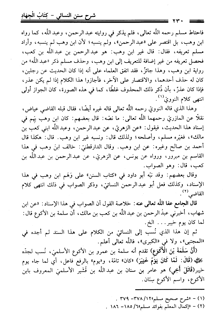 فاحتاط مسلم -رحمه اللَّه تعالى-، فلم يذكر في روايته عبد الرحمن، وعبد اللَّه، كما رواه ابن وهب، بل اقتصر على "عبد الرحمن"، ولم ينسبه؛ لأن ابن وهب لم ينسبه، وأراد مسلم تعريفه، فقال: قال غير ابن وهب: هو عبد الرحمن بن عبد اللَّه بن كعب، فحصل تعريفه من غير إضافة للتعريف إلى ابن وهب، وحذف مسلم ذكر "عبد اللَّه" من رواية ابن وهب، وهذا جائزٌ، فقد اتفق العلماء على أنه إذا كان الحديث عن رجلين، كان له حذف أحدهما، والاقتصار على الآخر، فأجازوا هذا الكلام إذا لم يكن عذر، فإذا كان عذرٌ، بأن ذُكر ذلك المحذوف غلطًا، كما في هذه الصورة، كان الجواز أولى انتهى كلام النوويّ (¬1).