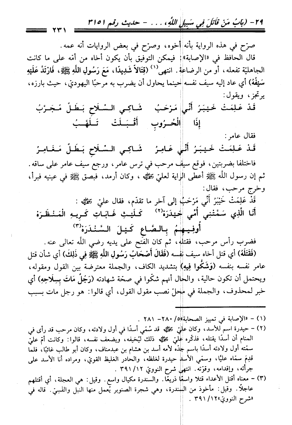 قال الحافظ في "الإصابة": فيمكن التوفيق بأن يكون أخاه من أمّه على ما كانت الجاهليّة تفعله، أو من الرضاع. انتهى (¬1) (قِتَالاً شَدِيدًا، مَعَ رَسُولِ اللهِ - صلى اللَّه عليه وسلم -، فَارْتَدَّ عَلَيْهِ سَيْفْهُ) أي عاد إليه سيف نفسه حينما يحاول أن يضرب به مرحبًا اليهوديّ، حيث بارزه، يرتجز، ويقول: