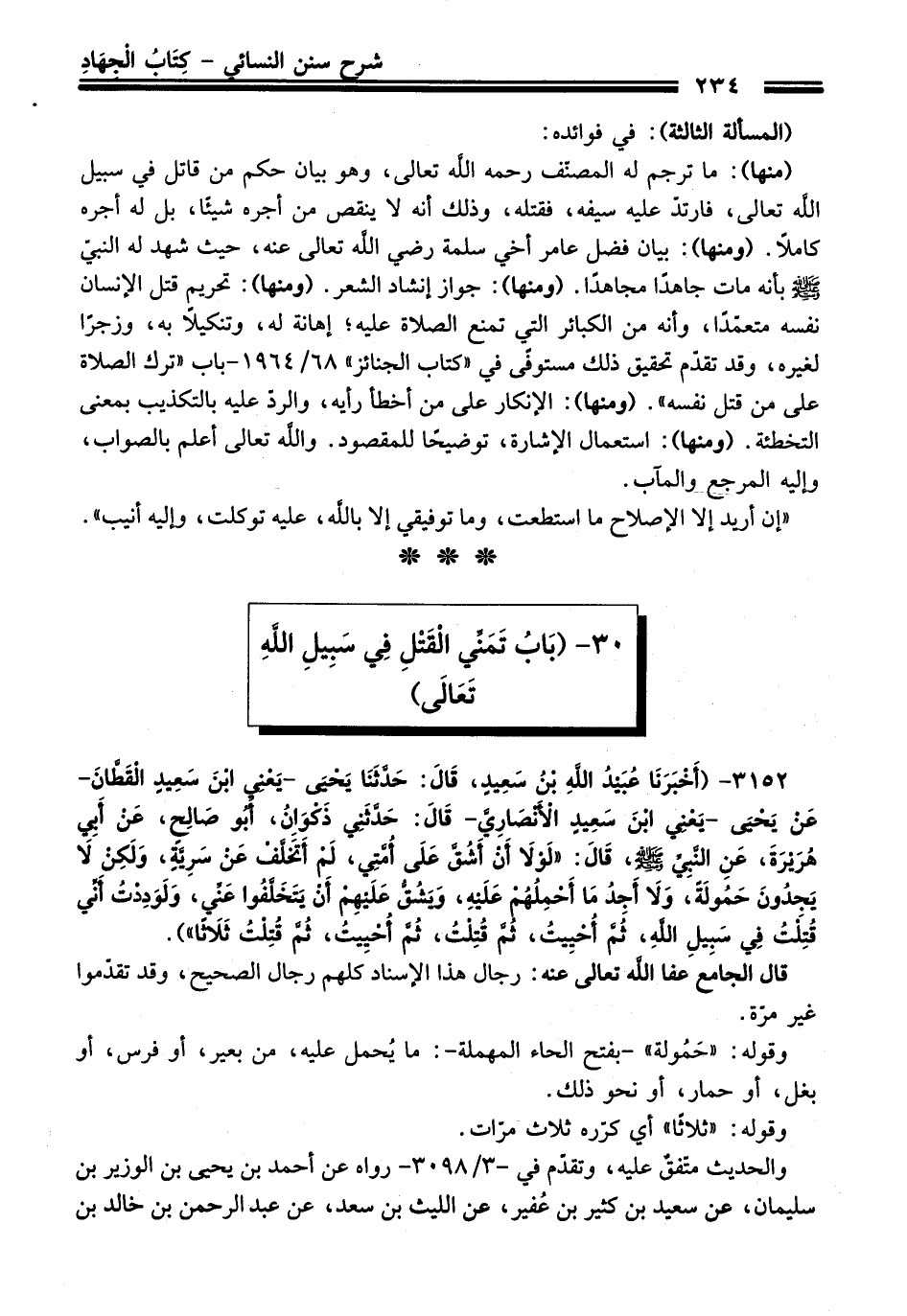 3152 - (أَخْبَرَنَا عُبَيْدُ اللَّهِ بْنُ سَعِيدٍ, قَالَ: حَدَّثَنَا يَحْيَى -يَعْنِي ابْنَ سَعِيدٍ الْقَطَّانَ- عَنْ يَحْيَى -يَعْنِي ابْنَ سَعِيدٍ الأَنْصَارِيَّ- قَالَ: حَدَّثَنِي ذَكْوَانُ, أَبُو صَالِحٍ, عَنْ أَبِي هُرَيْرَةَ, عَنِ النَّبِيِّ - صلى اللَّه عليه وسلم -, قَالَ: «لَوْلاَ أَنْ أَشُقَّ عَلَى أُمَّتِي, لَمْ أَتَخَلَّفْ عَنْ سَرِيَّةٍ, وَلَكِنْ لاَ يَجِدُونَ حَمُولَةً, وَلاَ أَجِدُ مَا أَحْمِلُهُمْ عَلَيْهِ, وَيَشُقُّ عَلَيْهِمْ أَنْ يَتَخَلَّفُوا عَنِّي, وَلَوَدِدْتُ أَنِّي قُتِلْتُ فِي سَبِيلِ اللهِ, ثُمَّ أُحْيِيتُ, ثُمَّ قُتِلْتُ, ثُمَّ أُحْيِيتُ, ثُمَّ قُتِلْتُ ثَلاَثًا»).