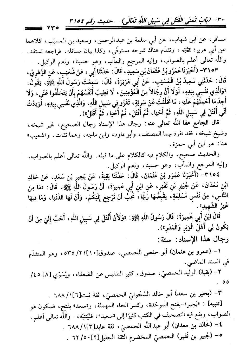 3153 - (أَخْبَرَنَا عَمْرُو بْنُ عُثْمَانَ بْنِ سَعِيدٍ, قَالَ: حَدَّثَنَا أَبِي, عَنْ شُعَيْبٍ, عَنِ الزُّهْرِيِّ,, قَالَ: حَدَّثَنِي سَعِيدُ بْنُ الْمُسَيَّبِ, عَنْ أَبِي هُرَيْرَةَ,, قَالَ: سَمِعْتُ رَسُولَ اللهِ - صلى اللَّه عليه وسلم -, يَقُولُ «وَالَّذِي نَفْسِي بِيَدِهِ, لَوْلاَ أَنَّ رِجَالاً مِنَ الْمُؤْمِنِينَ, لاَ تَطِيبُ أَنْفُسُهُمْ بِأَنْ يَتَخَلَّفُوا عَنِّي, وَلاَ أَجِدُ مَا أَحْمِلُهُمْ عَلَيْهِ, مَا تَخَلَّفْتُ عَنْ سَرِيَّةٍ, تَغْزُو فِي سَبِيلِ اللهِ, وَالَّذِي نَفْسِي بِيَدِهِ, لَوَدِدْتُ أَنِّي أُقْتَلُ فِي سَبِيلِ اللهِ, ثُمَّ أُحْيَا, ثُمَّ أُقْتَلُ, ثُمَّ أُحْيَا, ثُمَّ أُقْتَلُ»).