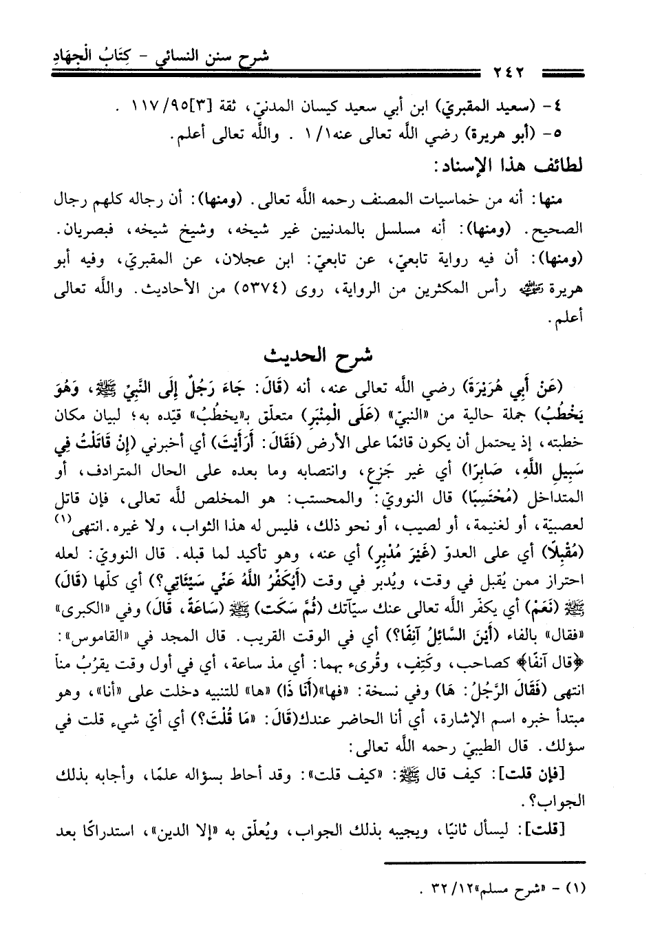 (عَنْ أَبِي هُرَيْرَةَ) - رضي اللَّه تعالى عنه -، أنه (قَالَ: جَاءَ رَجُلٌ إِلَى النَّبِيِّ - صلى اللَّه عليه وسلم -، وَهُوَ يَخْطُبُ) جملة حالية من "النبيّ"، (عَلَى الْمِنْبَرِ) متعلّق بـ"يخطُبُ" قيّده به؛ لبيان مكان خطبته، إذ يحتمل أن يكون قائمًا على الأرض (فَقَالَ: أَرَأَيْتَ) أي أخبرني (إِنْ قَاتَلْتُ فِي سَبِيلِ اللهِ، صَابِرًا) أي غير جَزع، وانتصابه وما بعده على الحال المترادف، أو المتداخل (مُحْتَسِبًا) قال النوويّ: والمحستب: هو المخلص للَّه تعالى، فإن قاتل لعصبيّة، أو لغنيمة، أو لصيب، أو نحو ذلك، فليس له هذا الثواب، ولا غيره. انتهى (¬1) (مُقْبِلاً) أي على العدوّ (غَيْرَ مُدْبِرٍ) أي عنه، وهو تأكيد لما قبله. قال النوويّ: لعله احتراز ممن يُقبل في وقت، ويُدبر في وقت (أَيُكَفِّرُ اللَّهُ عَنِّي سَيِّئَاتِي؟) أي كلّها (قَالَ) - صلى اللَّه عليه وسلم - (نَعَمْ) أي يكفّر اللَّه تعالى عنك سيّآتك (ثُمَّ سَكَت) - صلى اللَّه عليه وسلم - (سَاعَةً، قَالَ) وفي "الكبرى" "فقال" بالفاء (أَينَ السَّائِلُ آنِفًا؟) أي في الوقت القريب. قال المجد في "القاموس": {قال آنفًا} كصاحب، وكَتِفٍ، وقُرىء بهما: أي مذ ساعة، أي في أول وقت يقرُبُ منّا انتهى (فَقَالَ الرَّجُلُ: هَا) وفي نسخة: "فها" (أَنَا ذَا) "ها" للتنبيه دخلت على "أنا"، وهو مبتدأ خبره اسم الإشارة، أي أنا الحاضر عندك (قَالَ: "مَا قُلْتَ؟) أي أيّ شيء قلت في سؤلك. قال الطيبيّ -رحمه اللَّه تعالى-: