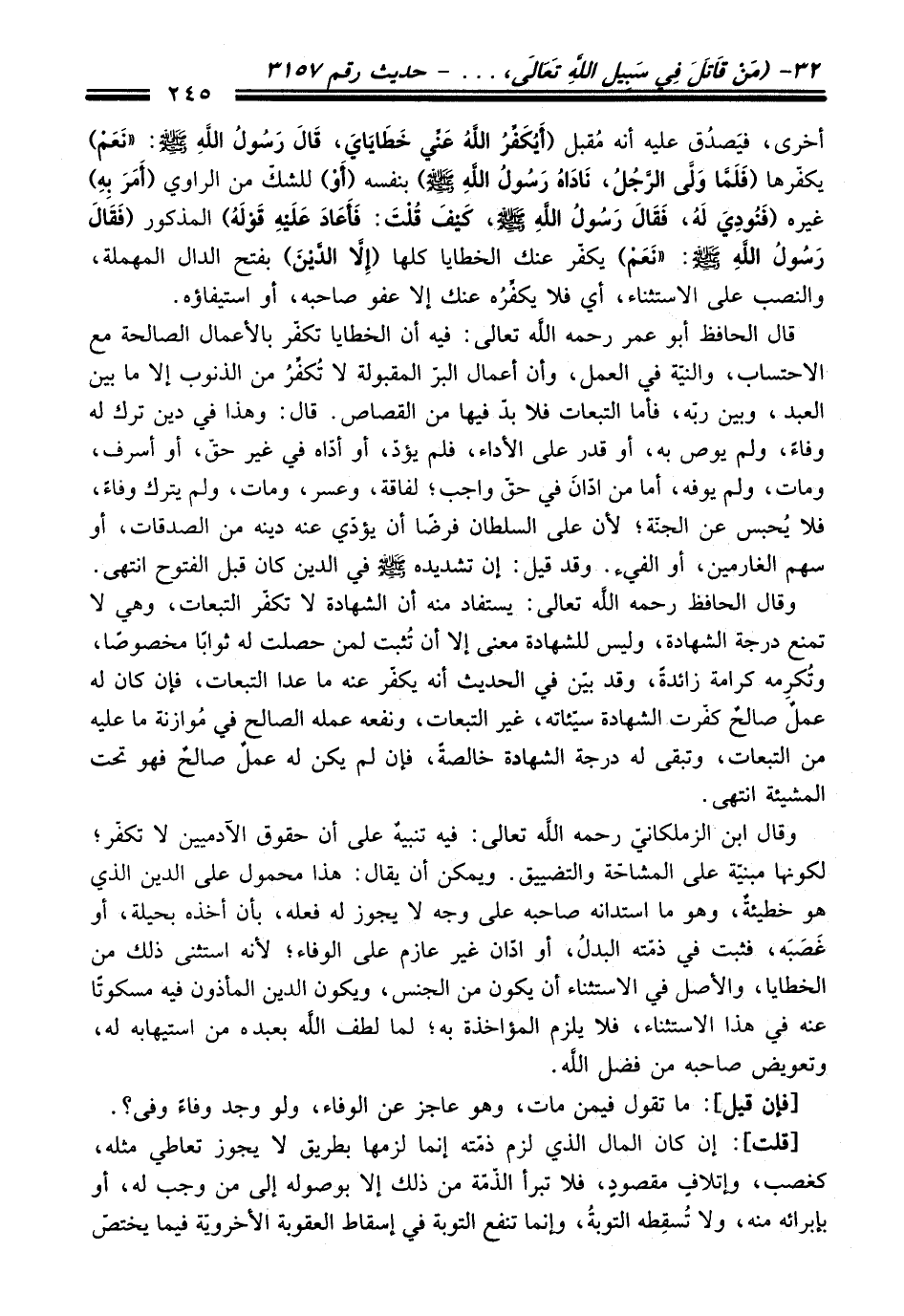 قال الحافظ أبو عمر -رحمه اللَّه تعالى-: فيه أن الخطايا تكفّر بالأعمال الصالحة مع الاحتساب، والنيّة في العمل، وأن أعمال البرّ المقبولة لا تُكفِّرُ من الذنوب إلا ما بين العبد، وبين ربّه، فأما التبعات فلا بدّ فيها من القصاص. قال: وهذا في دين ترك له وفاءً، ولم يوص به، أو قدر على الأداء، فلم يؤدّ، أو أدّاه في غير حقّ، أو أسرف، ومات، ولم يوفه، أما من ادّانَ في حقّ واجب؛ لفاقة، وعسر، ومات، ولم يترك وفاءً، فلا يُحبس عن الجنّة؛ لأن على السلطان فرضًا أن يؤدّي عنه دينه من الصدقات، أو سهم الغارمين، أو الفيء. وقد قيل: إن تشديده - صلى اللَّه عليه وسلم - في الدين كان قبل الفتوح انتهى. وقال الحافظ -رحمه اللَّه تعالى-: يستفاد منه أن الشهادة لا تكفّر التبعات، وهي لا تمنع درجة الشهادة، وليس للشهادة معنى إلا أن تُثبت لمن حصلت له ثوابًا مخصوصًا، وتُكرمه كرامة زائدةً، وقد بين في الحديث أنه يكفّر عنه ما عدا التبعات، فإن كان له عمل صالحٌ كفّرت الشهادة سيّئاته، غير التبعات، ونفعه عمله الصالح في مُوازنة ما عليه من التبعات، وتبقى له درجة الشهادة خالصةً، فإن لم يكن له عملٌ صالحٌ فهو تحت المشيئة انتهى.