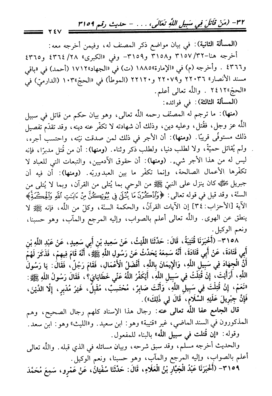 3158 - (أَخْبَرَنَا قُتَيْبَةُ, قَالَ: حَدَّثَنَا اللَّيْثُ, عَنْ سَعِيدِ بْنِ أَبِي سَعِيدٍ, عَنْ عَبْدِ اللَّهِ بْنِ أَبِي قَتَادَةَ, عَنْ أَبِي قَتَادَةَ, أَنَّهُ سَمِعَهُ يُحَدِّثُ عَنْ رَسُولِ اللهِ - صلى اللَّه عليه وسلم -, أَنَّهُ قَامَ فِيهِمْ, فَذَكَرَ لَهُمْ أَنَّ الْجِهَادَ فِي سَبِيلِ اللهِ, وَالإِيمَانَ بِاللَّهِ, أَفْضَلُ الأَعْمَالِ, فَقَامَ رَجُلٌ, فَقَالَ: يَا رَسُولَ اللهِ, أَرَأَيْتَ, إِنْ قُتِلْتُ فِي سَبِيلِ اللهِ, أَيُكَفِّرُ اللَّهُ عَنِّي خَطَايَايَ؟ , فَقَالَ: رَسُولُ اللهِ - صلى اللَّه عليه وسلم -: «نَعَمْ, إِنْ قُتِلْتَ فِي سَبِيلِ اللهِ, وَأَنْتَ صَابِرٌ, مُحْتَسِبٌ, مُقْبِلٌ, غَيْرُ مُدْبِرٍ, إِلاَّ الدَّيْنَ, فَإِنَّ جِبْرِيلَ - عَلَيْهِ السَّلاَمُ -, قَالَ لِي ذَلِكَ»).