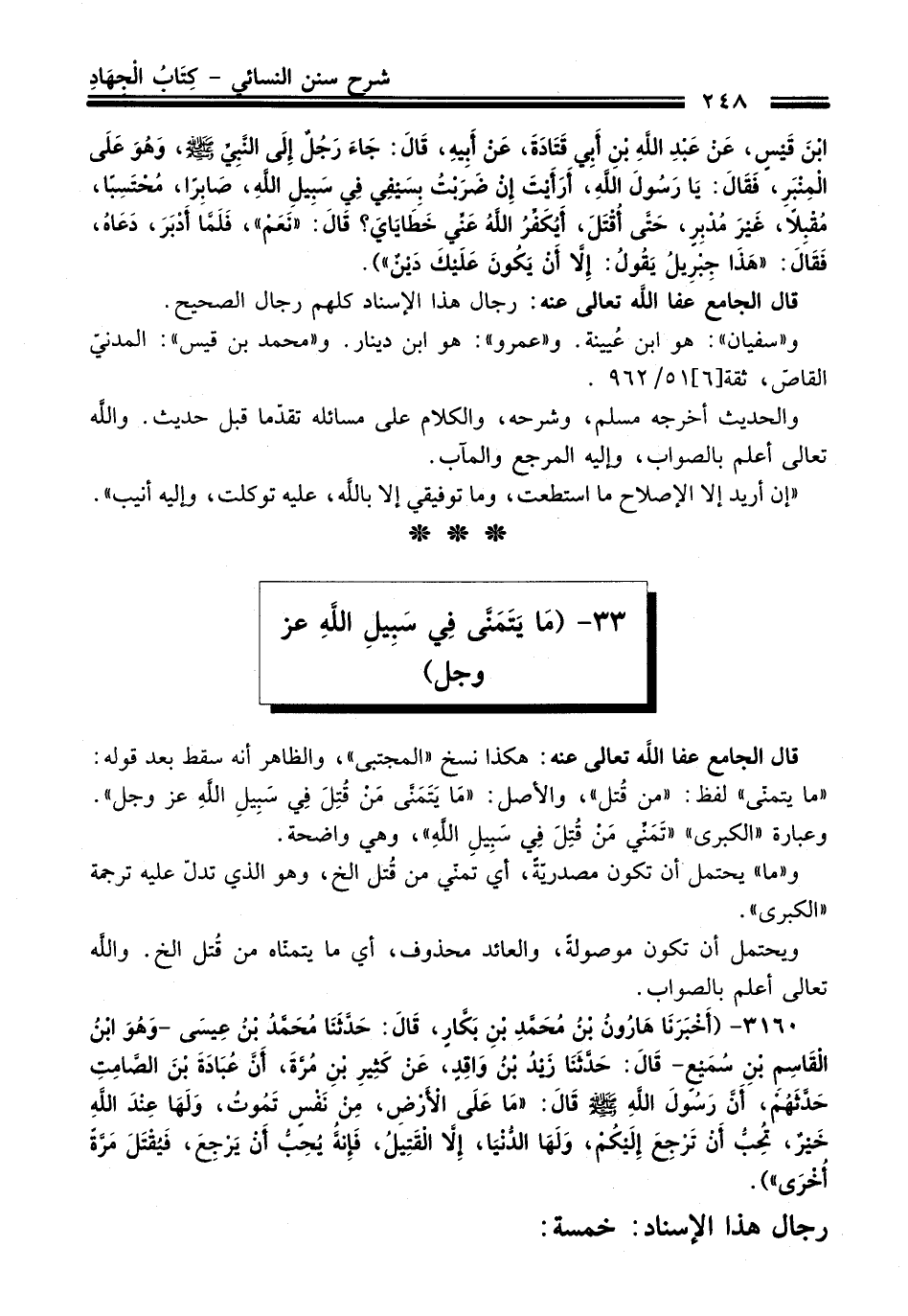 قال الجامع - عفا اللَّه تعالى عنه -: هكذا نسخ "المجتبى"، والظاهر أنه سقط بعد قوله: "ما يتمنّى" لفظ: "من قُتل"، والأصل: "مَا يَتَمَنَّى مَنْ قُتِلَ فِي سَبِيلِ اللهِ -عَزَّ وَجَلَّ-". وعبارة "الكبرى" "تَمَنّي مَنْ قُتِلَ فِي سَبيلِ اللَّهِ"، وهي واضحة.