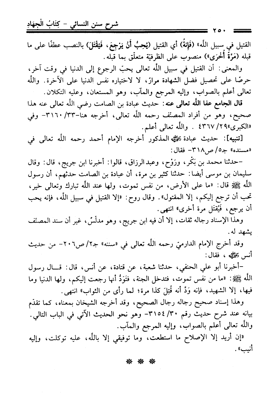 - أخبرنا أبو علي الحنفي، حدثنا شعبة، عن قتادة، عن أنس، قال: قال رسول اللَّه - صلى اللَّه عليه وسلم -: "ما من نفس تموت، فتدخل الجنّة، فتَوَدُّ أنها رجعت إليكم، ولها الدنيا وما فيها، إلا الشهيد، فإنه وَدَّ أنه قُتِلَ كذا مرّة؛ لما رأى من الثواب" انتهى.
