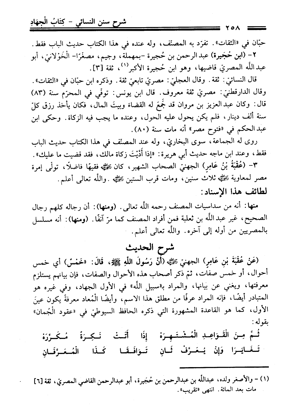 (عَنْ عُقْبَةَ بْنِ عَامِرٍ) الجهنيّ - رضي اللَّه عنه - (أنَّ رَسُولَ اللهِ - صلى اللَّه عليه وسلم -، قَالَ: "خَمْسٌ) أي خمس أحوال، أو خمس صفات، ثمّ ذكر أصحاب هذه الأحوال والصفات، فإن بيانهم يستلزم معرفتها، ويغني عن بيانها، والمراد بـ"سبيل اللَّه" في الأول الجهاد، وفي غيره هو المتبادر أيضًا، فإنه المراد عرفًا من مطلق هذا الاسم، وأيضًا الْمُعاد معرفةً يكون عينَ الأول، كما هو القاعدة المشهورة التي ذكره الحافظ السيوطيّ في "عقود الْجُمان" بقوله: