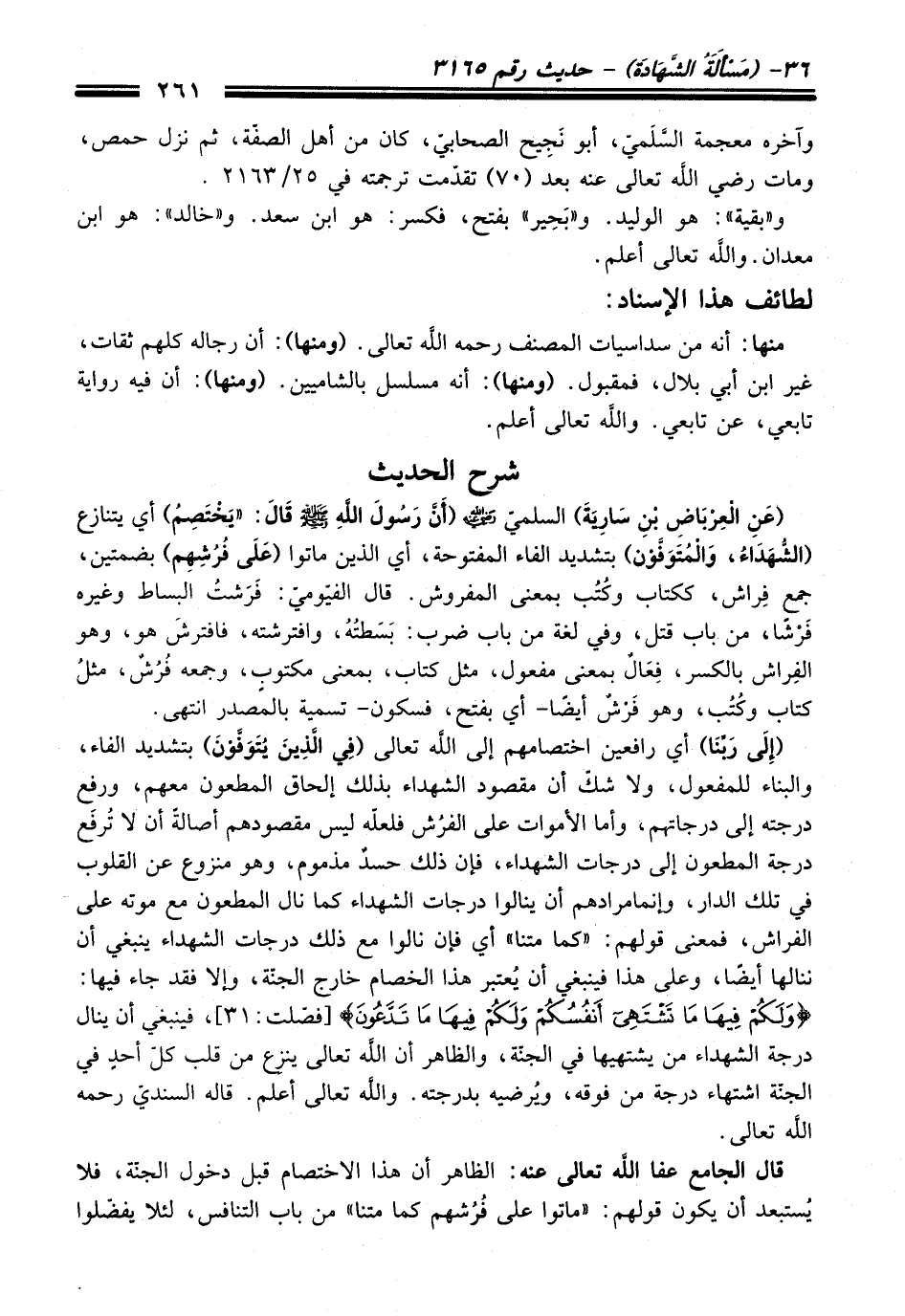 (عَنِ الْعِرْبَاضِ بْنِ سَارِيَةَ) السلميّ - رضي اللَّه عنه - (أَنَّ رَسُولَ اللهِ - صلى اللَّه عليه وسلم - قَالَ: "يَخْتَصِمُ) أي يتنازع (الشُهَدَاءُ، وَالْمُتَوَفوْن) بتشديد الفاء المفتوحة، أي الذين ماتوا (عَلَى فُرُشِهِم) بضمتين، جمع فِراش، ككتاب وكُتُب بمعنى المفروش. قال الفيّوميّ: فَرَشتُ البساط وغيره فَرْشًا، من باب قتل، وفي لغة من باب ضرب: بَسَطتُهُ، وافترشته، فافترشَ هو، وهو الفِراش بالكسر، فِعَالٌ بمعنى مفعول، مثل كتاب، بمعنى مكتوب، وجمعه فُرُشٌ، مثلُ كتاب وكُتُب، وهو فَرْشٌ أيضًا- أي بفتح، فسكون- تسمية بالمصدر انتهى.