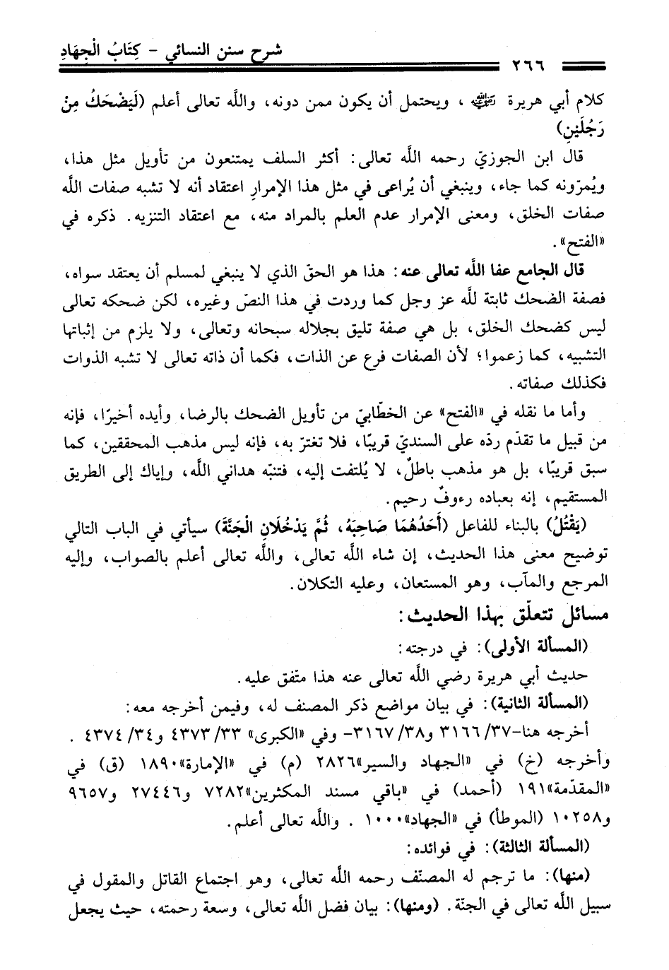 قال الجامع - عفا اللَّه تعالى عنه -: هذا هو الحقّ الذي لا ينبغي لمسلم أن يعتقد سواه، فصفة الضحك ثابتة للَّه -عَزَّ وَجَلَّ-كما وردت في هذا النصّ وغيره، لكن ضحكه تعالى ليس كضحك الخلق، بل هي صفة تليق بجلاله سبحانه وتعالى، ولا يلزم من إثباتها التشبيه، كما زعموا؛ لأن الصفات فرع عن الذات، فكما أن ذاته تعالى لا تشبه الذوات فكذلك صفاته.