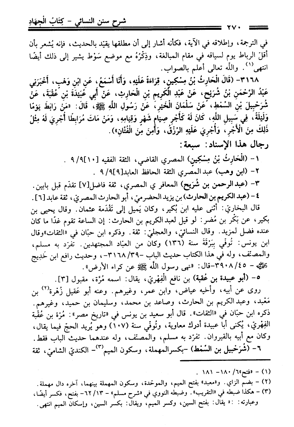 3168 - قَالَ: الْحَارِثُ بْنُ مِسْكِينٍ, قِرَاءَةً عَلَيْهِ, وَأَنَا أَسْمَعُ, عَنِ ابْنِ وَهْبٍ, أَخْبَرَنِي عَبْدُ الرَّحْمَنِ بْنُ شُرَيْحٍ, عَنْ عَبْدِ الْكَرِيمِ بْنِ الْحَارِثِ, عَنْ أَبِي عُبَيْدَةَ بْنِ عُقْبَةَ, عَنْ شُرَحْبِيلَ بْنِ السِّمْطِ, عَنْ سَلْمَانَ الْخَيْرِ, عَنْ رَسُولِ اللَّهِ - صلى اللَّه عليه وسلم -, قَالَ: «مَنْ رَابَطَ يَوْمًا وَلَيْلَةً, فِي سَبِيلِ اللهِ, كَانَ لَهُ كَأَجْرِ صِيَامِ شَهْرٍ وَقِيَامِهِ, وَمَنْ مَاتَ مُرَابِطًا أُجْرِيَ لَهُ مِثْلُ ذَلِكَ مِنَ الأَجْرِ, وَأُجْرِىَ عَلَيْهِ الرِّزْقُ, وَأَمِنَ مِنَ الْفَتَّانِ»).