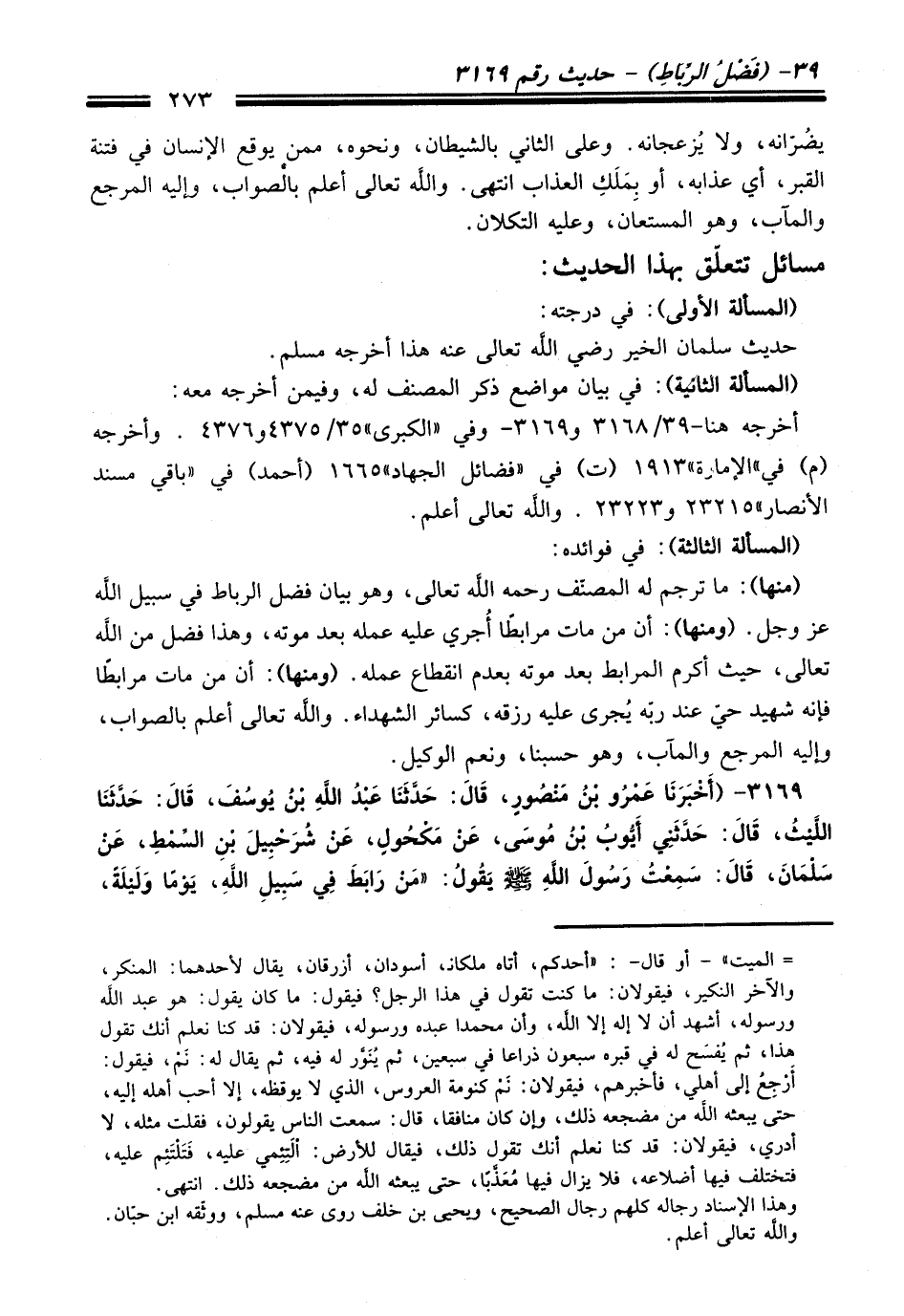 3169 - (أَخْبَرَنَا عَمْرُو بْنُ مَنْصُورٍ, قَالَ: حَدَّثَنَا عَبْدُ اللَّهِ بْنُ يُوسُفَ, قَالَ: حَدَّثَنَا اللَّيْثُ, قَالَ: حَدَّثَنِي أَيُّوبُ بْنُ مُوسَى, عَنْ مَكْحُولٍ, عَنْ شُرَحْبِيلَ بْنِ السِّمْطِ, عَنْ سَلْمَانَ, قَالَ: سَمِعْتُ رَسُولَ اللهِ - صلى اللَّه عليه وسلم - يَقُولُ: «مَنْ رَابَطَ فِي سَبِيلِ اللهِ, يَوْمًا وَلَيْلَةً,