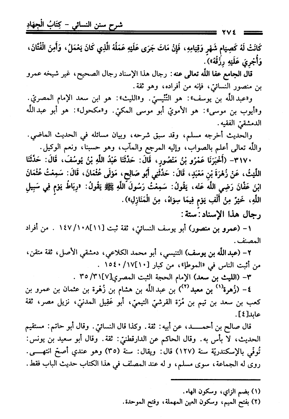3170 - (أَخْبَرَنَا عَمْرُو بْنُ مَنْصُورٍ, قَالَ: حَدَّثَنَا عَبْدُ اللَّهِ بْنُ يُوسُفَ, قَالَ: حَدَّثَنَا اللَّيْثُ, عَنْ زَهْرَةَ بْنِ مَعْبَدٍ, قَالَ: حَدَّثَنِي أَبُو صَالِحٍ, مَوْلَى عُثْمَانَ, قَالَ: سَمِعْتُ عُثْمَانَ بْنَ عَفَّانَ - رضي اللَّه عنه -, يَقُولُ: سَمِعْتُ رَسُولَ اللهِ - صلى اللَّه عليه وسلم - يَقُولُ: «رِبَاطُ يَوْمٍ فِي سَبِيلِ اللهِ, خَيْرٌ مِنْ أَلْفِ يَوْمٍ فِيمَا سِوَاهُ, مِنَ الْمَنَازِلِ»).