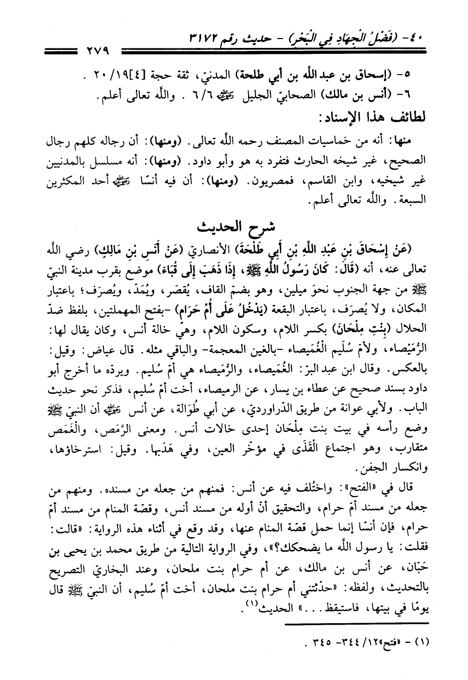 قال في "الفتح": واختُلف فيه عن أنس: فمنهم من جعله من مسنده. ومنهم من جعله من مسند أمّ حرام، والتحقيق أنّ أوله من مسند أنس، وقصّة المنام من مسند أمّ حرام، فإن أنسًا إنما حمل قصّة المنام عنها، وقد وقع في أثناء هذه الرواية: "قالت: فقلت: يا رسول اللَّه ما يضحكك؟ "، وفي الرواية التالية من طريق محمد بن يحيى بن