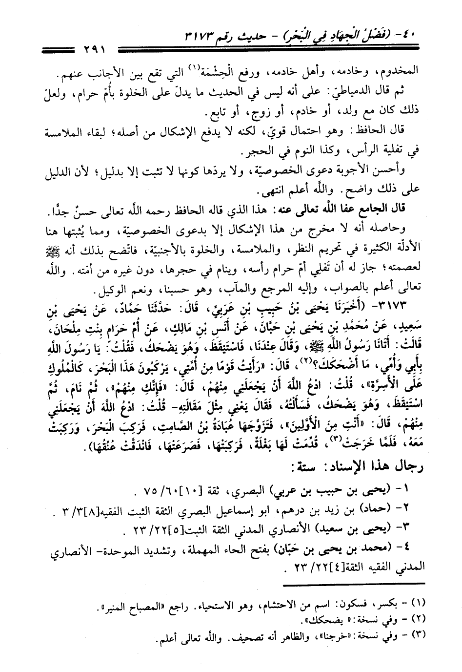 3173 - (أَخْبَرَنَا يَحْيَى بْنُ حَبِيبِ بْنِ عَرَبِيٍّ, قَالَ: حَدَّثَنَا حَمَّادٌ, عَنْ يَحْيَى بْنِ سَعِيدٍ, عَنْ مُحَمَّدِ بْنِ يَحْيَى بْنِ حَبَّانَ, عَنْ أَنَسِ بْنِ مَالِكٍ, عَنْ أُمِّ حَرَامٍ بِنْتِ مِلْحَانَ, قَالَتْ: أَتَانَا رَسُولُ اللَّهِ - صلى اللَّه عليه وسلم -, وَقَالَ عِنْدَنَا, فَاسْتَيْقَظَ, وَهُوَ يَضْحَكُ, فَقُلْتُ يَا رَسُولَ اللهِ بِأَبِي وَأُمِّي, مَا أَضْحَكَكَ؟ (¬2) , قَالَ: «رَأَيْتُ قَوْمًا مِنْ أُمَّتِي, يَرْكَبُونَ هَذَا الْبَحْرَ, كَالْمُلُوكِ عَلَى الأَسِرَّةِ» , قُلْتُ: ادْعُ اللَّهَ أَنْ يَجْعَلَنِي مِنْهُمْ, قَالَ: «فَإِنَّكِ مِنْهُمْ» , ثُمَّ نَامَ, ثُمَّ اسْتَيْقَظَ, وَهُوَ يَضْحَكُ, فَسَأَلْتُهُ, فَقَالَ يَعْنِي مِثْلَ مَقَالَتِهِ- قُلْتُ: ادْعُ اللَّهَ أَنْ يَجْعَلَنِي مِنْهُمْ, قَالَ: «أَنْتِ مِنَ الأَوَّلِينَ» ,