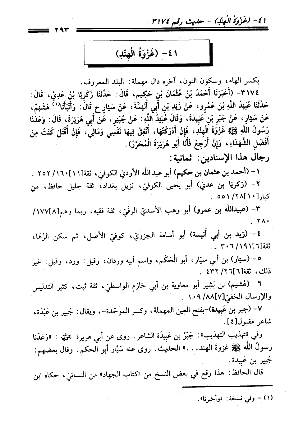 3174 - (أَخْبَرَنِي أَحْمَدُ بْنُ عُثْمَانَ بْنِ حَكِيمٍ, قَالَ: حَدَّثَنَا زَكَرِيَّا بْنُ عَدِيٍّ, قَالَ: حَدَّثَنَا عُبَيْدُ اللَّهِ بْنُ عَمْرٍو, عَنْ زَيْدِ بْنِ أَبِي أُنَيْسَةَ, عَنْ سَيَّارٍ ح قَالَ: وَأَنْبَأَنَا (¬1) هُشَيْمٌ, عَنْ سَيَّارٍ, عَنْ جَبْرِ بْنِ عَبِيدَةَ, وَقَالَ عُبَيْدُ اللَّهِ: عَنْ جُبَيْرٍ, عَنْ أَبِي هُرَيْرَةَ, قَالَ: وَعَدَنَا رَسُولُ اللَّهِ - صلى اللَّه عليه وسلم - غَزْوَةَ الْهِنْدِ, فَإِنْ أَدْرَكْتُهَا, أُنْفِقْ فِيهَا نَفْسِي وَمَالِي, فَإِنْ أُقْتَلْ كُنْتُ مِنْ أَفْضَلِ الشُّهَدَاءِ, وَإِنْ أَرْجِعْ فَأَنَا أَبُو هُرَيْرَةَ الْمُحَرَّرُ).