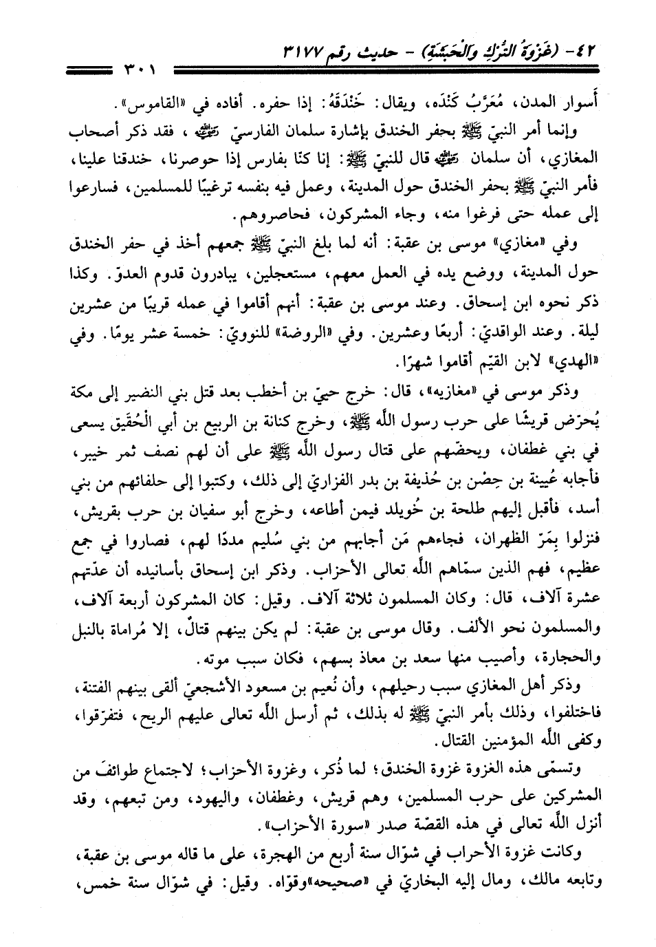 وذكر موسى في "مغازيه"، قال: خرج حييّ بن أخطب بعد قتل بني النضير إلى مكة يُحرّض قريشًا على حرب رسول اللَّه - صلى اللَّه عليه وسلم -، وخرج كنانة بن الربيع بن أبي الحُقَيق يسعى في بني غطفان، ويحضّهم على قتال رسول اللَّه - صلى اللَّه عليه وسلم - على أن لهم نصف ثمر خيبر، فأجابه عُيينة بن حِصْن بن حُذيفة بن بدر الفزاريّ إلى ذلك، وكتبوا إلى حلفائهم من بني أسد، فأقبل إليهم طلحة بن خُويلد فيمن أطاعه، وخرج أبو سفيان بن حرب بقريش، فنزلوا بِمَرّ الظهران، فجاءهم مَن أجابهم من بني سُليم مددًا لهم، فصاروا في جمع عظيم، فهم الذين سمّاهم اللَّه تعالى الأحزاب. وذكر ابن إسحاق بأسانيده أن عدّتهم عشرة آلاف، قال: وكان المسلمون ثلاثة آلاف. وقيل: كان المشركون أربعة آلاف، والمسلمون نحو الألف. وقال موسى بن عقبة: لم يكن بينهم قتالٌ، إلا مُراماة بالنبل والحجارة، وأصيب منها سعد بن معاذ بسهم، فكان سبب موته.