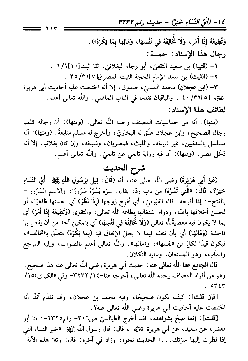 (عَنْ أَبِي هُرَيْرَةَ) - رضي اللَّه تعالى عنه -، أنه (قَالَ: قِيلَ لِرَسُولِ اللهِ - صلى اللَّه عليه وسلم -: أَيُّ النِّسَاءِ خَيْرٌ؟، قَالَ: "الَّتِي تَسُرُّهُ) من باب ردّ، يقال: سرّه يَسُرُّهُ سُرُورًا، والاسم السَّرُور - بالفتح-: إذا أفرحه. قاله الفيّوميّ، أي تُفرِح زوجها (إِذَا نَظَرَ) أي لحسنها ظاهرًا، أو لحسن أخلاقها باطنًا، ودوام اشتغالها بِطاعة اللَّه تعالى، والتقوى (وَتُطِيعُهُ إِذَا أَمَرَ) أي بما لا يكون فيه معصيةٌ للَّه تعالى (وَلَا تخُالِفُهُ فِي نَفْسِهَا) أي بتمكين أحد من أن يفعل بها فاحشة (وَمَالِهَا) أي بأن تنفقه فيما لا يحلّ الإنفاق فيه (بِمَا يَكرَهُ) متعلّق بـ"تخالف"، فيكون قيدًا لكلّ من "نفسها"، و"مالها". واللَّه تعالى أعلم بالصواب، وإليه المرجع والمآب، وهو المستعان، وعليه التكلان.