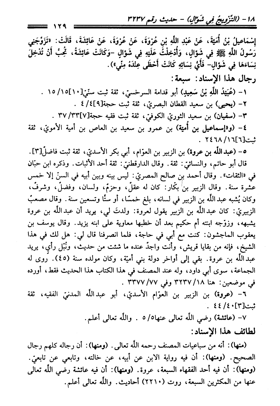 إِسْمَاعِيلُ بْنُ أُمَيَّةَ, عَنْ عَبْدِ اللَّهِ بْنِ عُرْوَةَ, عَنْ عُرْوَةَ, عَنْ عَائِشَةَ, قَالَتْ: تَزَوَّجَنِي رَسُولُ اللهِ - صلى اللَّه عليه وسلم - فِي شَوَّالٍ, وَأُدْخِلْتُ عَلَيْهِ فِي شَوَّالٍ -وَكَانَتْ عَائِشَةُ, تُحِبُّ أَنْ تُدْخِلَ نِسَاءَهَا فِي شَوَّالٍ- فَأَيُّ نِسَائِهِ كَانَتْ أَحْظَى عِنْدَهُ مِنِّي").