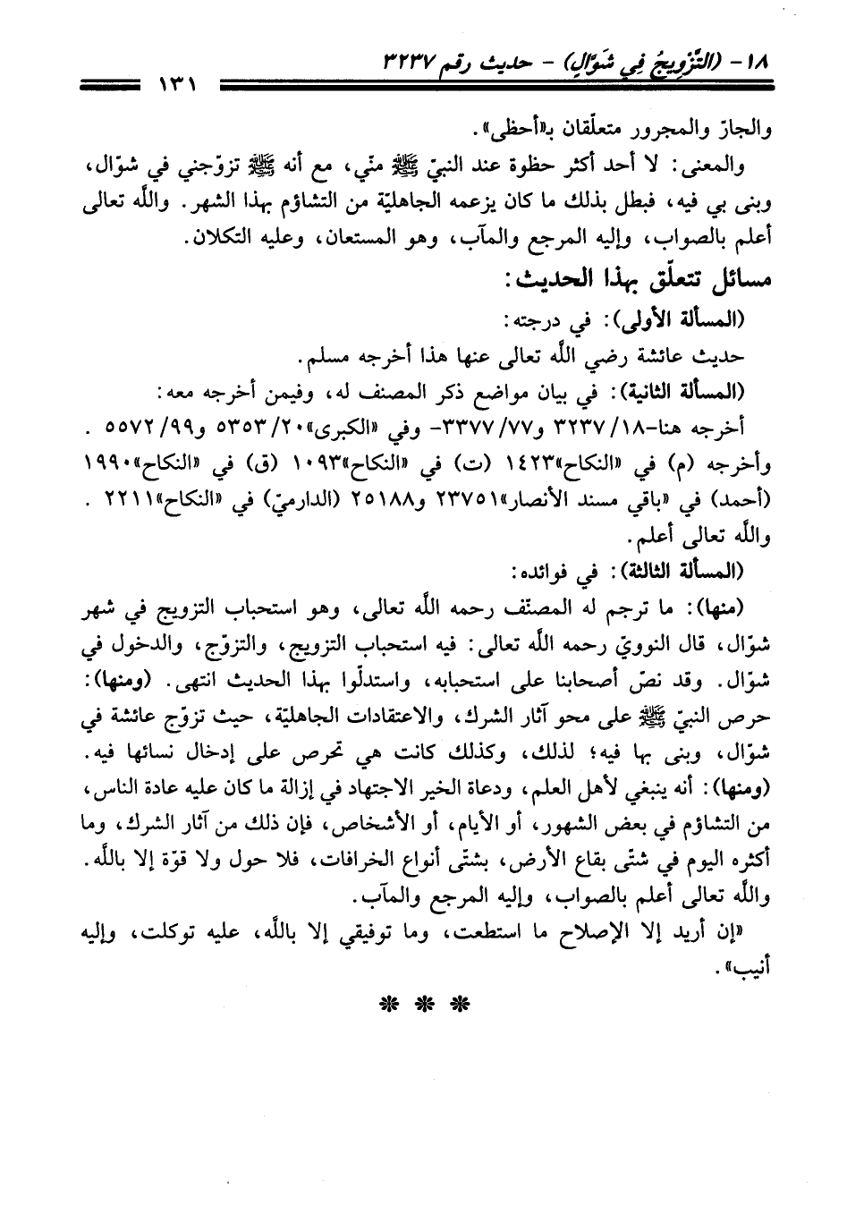 (منها): ما ترجم له المصنّف -رحمه اللَّه تعالى-، وهو استحباب التزويج في شهر شوّال، قال النوويّ -رحمه اللَّه تعالى-: فيه استحباب التزويج، والتزوّج، والدخول في شوّال. وقد نصّ أصحابنا على استحبابه، واستدلّوا بهذا الحديث انتهى. (ومنها): حرص النبيّ - صلى اللَّه عليه وسلم - على هو آثار الشرك، والاعتقادات الجاهليّة، حيث تزوّج عائشة في شوّال، وبنى بها فيه؛ لذلك، وكذلك كانت هي تحرص على إدخال نسائها فيه. (ومنها): أنه ينبغي لأهل العلم، ودعاة الخير الاجتهاد في إزالة ما كان عليه عادة الناس، من التشاؤم في بعض الشهور، أو الأيام، أو الأشخاص، فإن ذلك من آثار الشرك، وما أكثره اليوم في شتّى بقاع الأرض، بشتّى أنواع الخرافات، فلا حول ولا قوّة إلا باللَّه. واللَّه تعالى أعلم بالصواب، وإليه المرجع والمآب.