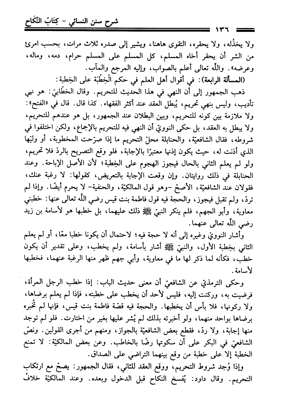 ذهب الجمهور إلى أن النهي في هذا الحديث للتحريم. وقال الخطّابيّ: هو نهي تأديب، وليس بنهي تحريم، يُبطل العقد عند أكثر الفقهاء. كذا قال. قال في "الفتح": ولا ملازمة بين كونه للتحريم، وبين البطلان عند الجمهور، بل هو عندهم للتحريم، ولا يبطل به العقد، بل حكى النوويّ أن النهي فيه للتحريم بالإجماع، ولكن اختلفوا في شروطه، فقال الشافعيّة، والحنابلة محلّ التحريم ما إذا صرّحت المخطوبة، أو وليّها الذي أذنت له، حيث يكون إذنها معتبرًا بالإجابة، فلو وقع التصريح بالردّ فلا تحريم، ولو لم يعلم الثاني بالحال فيجوز الهجوم على الخِطبة؛ لأن الأصل الإباحة. وعند الحنابلة في ذلك روايتان. وإن وقعت الإجابة بالتعريض، كقولها: لا رغبة عنك، فقولان عند الشافعيّة، الأصحّ -وهو قول المالكيّة، والحنفيّة- لا يحرم أيضًا. وإذا لم تردّ، ولم تقبل فيجوز، والحجة فيه قول فاطمة بنت قيس - رضي اللَّه تعالى عنها -: خطبني معاوية، وأبو الجهم، فلم ينكر النبيّ - صلى اللَّه عليه وسلم - ذلك عليهما، بل خطبها هو لأسامة بن زيد - رضي اللَّه تعالى عنهما -.