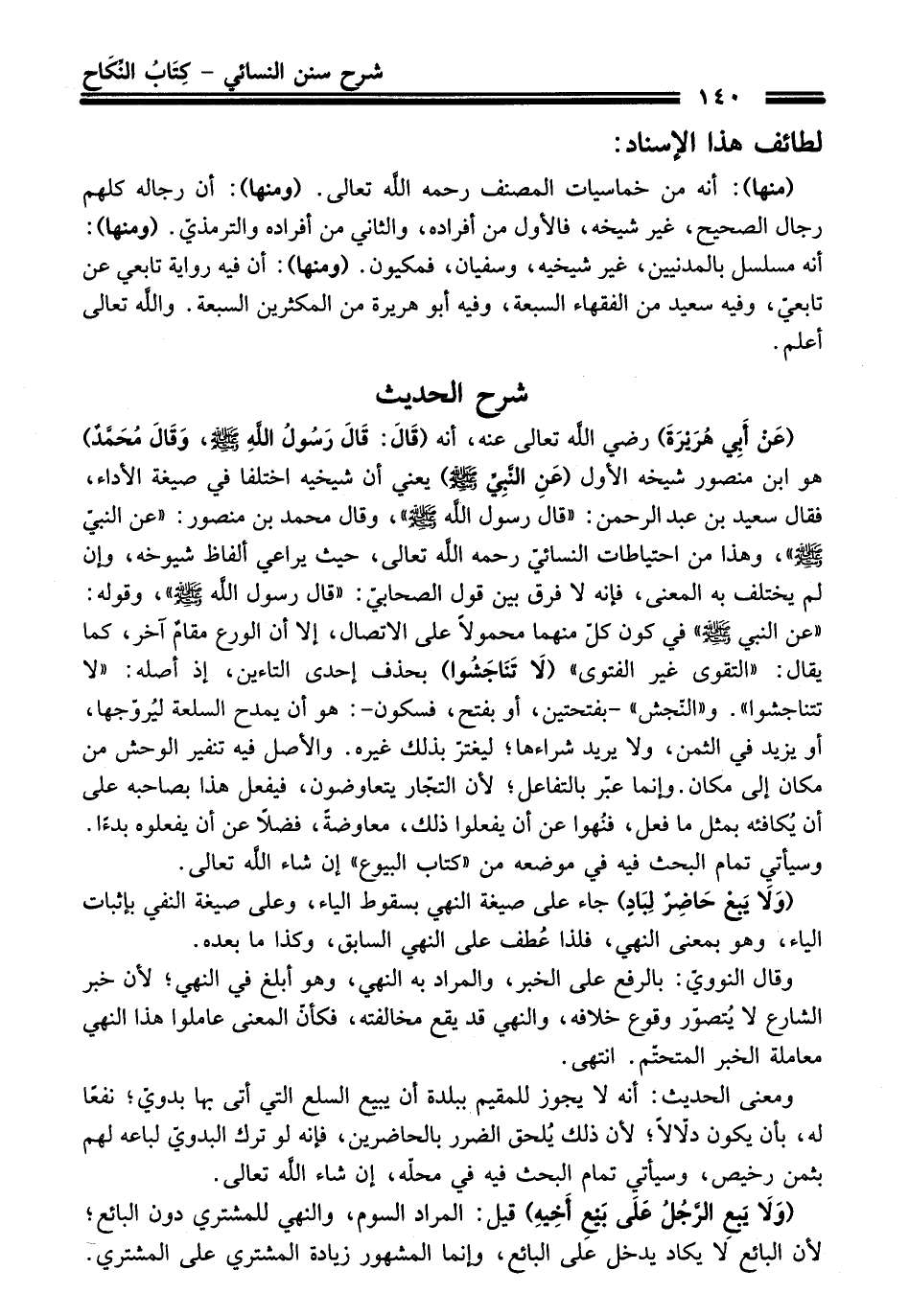 (عَنْ أَبِي هُرَيْرَةَ) - رضي اللَّه تعالى عنه -، أنه (قَالَ: قَالَ رَسُولُ اللهِ - صلى اللَّه عليه وسلم -:، وَقَالَ مُحَمَّدٌ) هو ابن منصور شيخه الأول (عَنِ النَّبِيِّ - صلى اللَّه عليه وسلم -) يعني أن شيخيه اختلفا في صيغة الأداء، فقال سعيد بن عبد الرحمن: "قال رسول اللَّه - صلى اللَّه عليه وسلم -"، وقال محمد بن منصور: "عن النبيّ - صلى اللَّه عليه وسلم -"، وهذا من احتياطات النسائيّ -رحمه اللَّه تعالى-، حيث يراعي ألفاظ شيوخه، وإن لم يختلف به المعنى، فإنه لا فرق بين قول الصحابيّ: "قال رسول اللَّه - صلى اللَّه عليه وسلم -"،وقوله: "عن النبيّ - صلى اللَّه عليه وسلم -" في كون كلّ منهما محمولاً على الاتصال، إلا أن الورع مقامٌ آخر، كما يقال: "التقوى غير الفتوى" (لَا تَنَاجَشُوا) بحذف إحدى التاءين، إذ أصله: "لا تتناجشوا". و"النّجش" -بفتحتين، أو بفتح، فسكون-: هو أن يمدح السلعة ليُروّجها، أو يزيد في الثمن، ولا يريد شراءها؛ ليغترّ بذلك غيره. والأصل فيه تنفير الوحش من مكان إلى مكان. وإنما عبّر بالتفاعل؛ لأن التجّار يتعاوضون، فيفعل هذا بصاحبه على