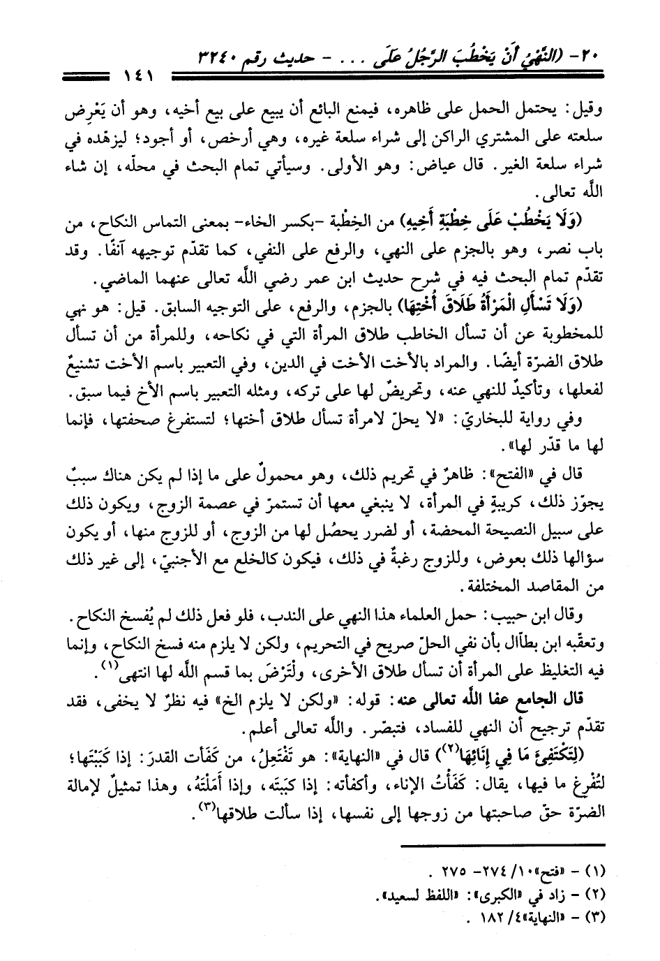 وقال ابن حبيب: حمل العلماء هذا النهي على الندب، فلو فعل ذلك لم يُفسخ النكاح. وتعقّبه ابن بطّال بأن نفي الحلّ صريح في التحريم، ولكن لا يلزم منه فسخ النكاح، وإنما فيه التغليظ على المرأة أن تسأل طلاق الأخرى، ولْتَرْضَ بما قسم اللَّه لها انتهى (¬1).