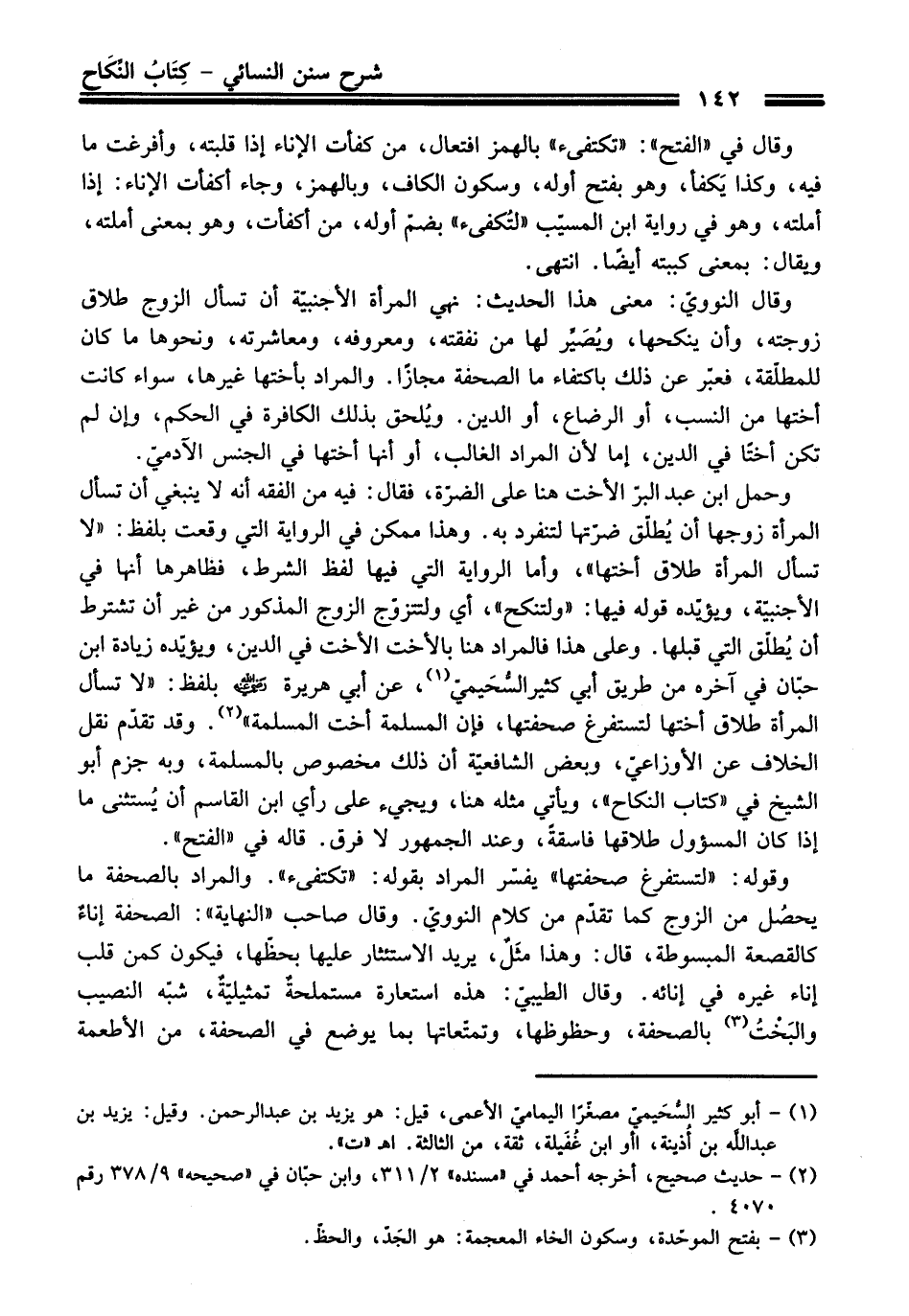 وقال النوويّ: معنى هذا الحديث: نهي المرأة الأجنبية أن تسأل الزوج طلاق زوجته، وأن ينكحها، ويُصَيِّر لها من نفقته، ومعروفه، ومعاشرته، ونحوها ما كان للمطلّقة، فعبّر عن ذلك باكتفاء ما الصحفة مجازًا. والمراد بأختها غيرها، سواء كانت أختها من النسب، أو الرضاع، أو الدين. ويُلحق بذلك الكافرة في الحكم، وإن لم تكن أختًا في الدين، إما لأن المراد الغالب، أو أنها أختها في الجنس الآدميّ.