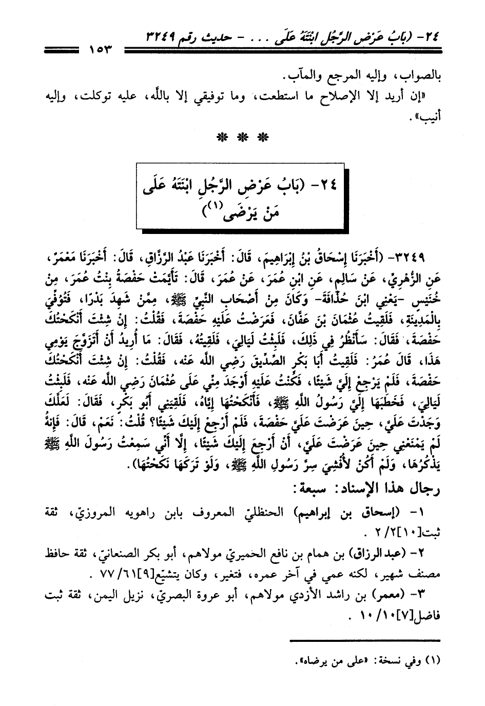 3249 - (أَخْبَرَنَا إِسْحَاقُ بْنُ إِبْرَاهِيمَ, قَالَ: أَنْبَأَنَا عَبْدُ الرَّزَّاقِ, قَالَ: أَنْبَأَنَا مَعْمَرٌ, عَنِ الزُّهْرِيِّ, عَنْ سَالِمٍ, عَنِ ابْنِ عُمَرَ, عَنْ عُمَرَ, قَالَ: تَأَيَّمَتْ حَفْصَةُ بِنْتُ عُمَرَ, مِنْ خُنَيْسٍ -يَعْنِي ابْنَ حُذَافَةَ- وَكَانَ مِنْ أَصْحَابِ النَّبِيِّ - صلى اللَّه عليه وسلم -, مِمَّنْ شَهِدَ بَدْرًا, فَتُوُفِّيَ بِالْمَدِينَةِ, فَلَقِيتُ عُثْمَانَ بْنَ عَفَّانَ, فَعَرَضْتُ عَلَيْهِ حَفْصَةَ, فَقُلْتُ: إِنْ شِئْتَ أَنْكَحْتُكَ حَفْصَةَ, فَقَالَ: سَأَنْظُرُ فِي ذَلِكَ, فَلَبِثْتُ لَيَالِيَ, فَلَقِيتُهُ, فَقَالَ: مَا أُرِيدُ أَنْ أَتَزَوَّجَ يَوْمِي هَذَا, قَالَ عُمَرُ: فَلَقِيتُ أَبَا بَكْرٍ الصِّدِّيقَ - رضي اللَّه عنه -, فَقُلْتُ إِنْ شِئْتَ أَنْكَحْتُكَ حَفْصَةَ, فَلَمْ يَرْجِعْ إِلَيَّ شَيْئًا, فَكُنْتُ عَلَيْهِ أَوْجَدَ مِنِّي عَلَى عُثْمَانَ - رَضِيَ اللَّهُ عَنْهُ -, فَلَبِثْتُ لَيَالِيَ, فَخَطَبَهَا إِلَيَّ رَسُولُ اللهِ - صلى اللَّه عليه وسلم -, فَأَنْكَحْتُهَا إِيَّاهُ فَلَقِيَنِي أَبُو بَكْرٍ, فَقَالَ: لَعَلَّكَ وَجَدْتَ عَلَيَّ, حِينَ عَرَضْتَ عَلَيَّ حَفْصَةَ, فَلَمْ أَرْجِعْ إِلَيْكَ شَيْئًا؟ قُلْتُ: نَعَمْ, قَالَ: فَإِنَّهُ لَمْ يَمْنَعْنِى حِينَ عَرَضْتَ عَلَيَّ, أَنْ أَرْجِعَ إِلَيْكَ شَيْئًا, إِلاَّ أَنِّي سَمِعْتُ رَسُولَ اللهِ - صلى اللَّه عليه وسلم - يَذْكُرُهَا, وَلَمْ أَكُنْ لأُفْشِيَ سِرَّ رَسُولِ اللهِ - صلى اللَّه عليه وسلم -, وَلَوْ تَرَكَهَا نَكَحْتُهَا).