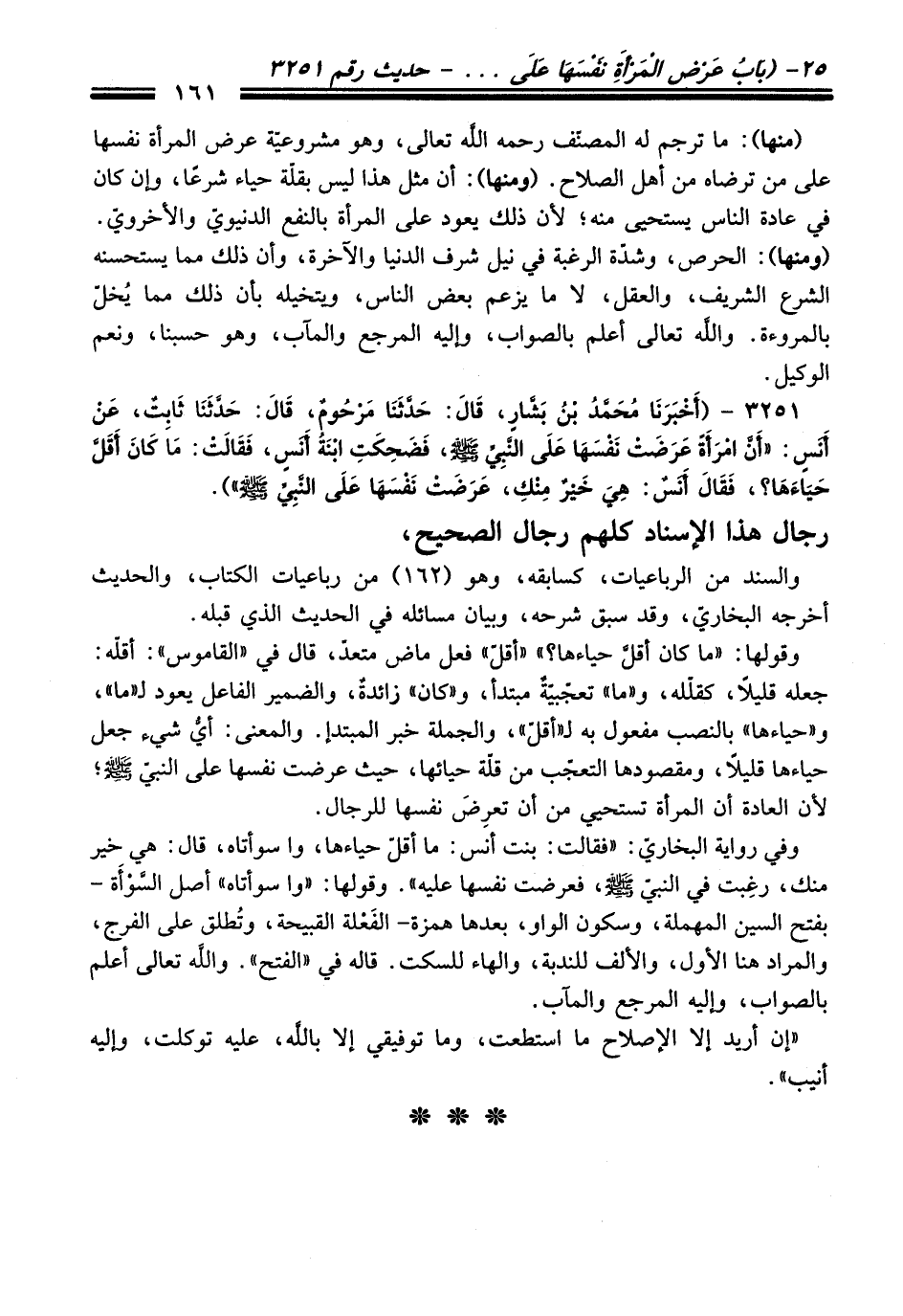 3251 - (أَخْبَرَنَا مُحَمَّدُ بْنُ بَشَّارٍ, قَالَ: حَدَّثَنَا مَرْحُومٌ, قَالَ: حَدَّثَنَا ثَابِتٌ, عَنْ أَنَسٍ: "أَنَّ امْرَأَةً عَرَضَتْ نَفْسَهَا عَلَى النَّبِيِّ - صلى اللَّه عليه وسلم -, فَضَحِكَتِ ابْنَةُ أَنَسٍ, فَقَالَتْ: مَا كَانَ أَقَلَّ حَيَاءَهَا؟ , فَقَالَ أَنَسٌ: هِيَ خَيْرٌ مِنْكِ, عَرَضَتْ نَفْسَهَا عَلَى النَّبِيِّ - صلى اللَّه عليه وسلم -").