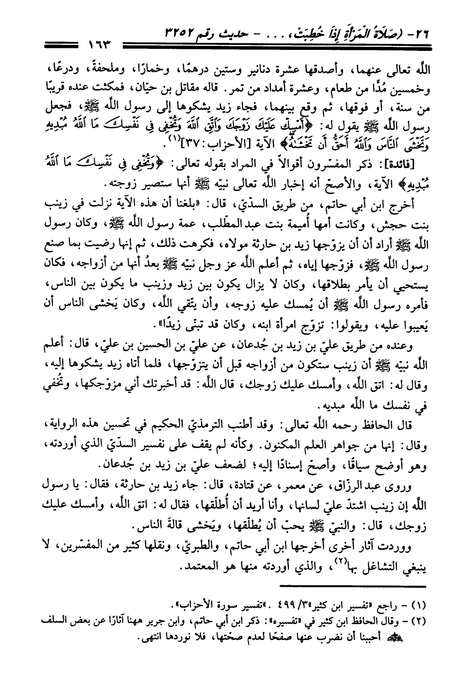 [فائدة]: ذكر المفسّرون أقوالاً في المراد بقوله تعالى: {وَتُخْفِي فِي نَفْسِكَ مَا اللَّهُ مُبْدِيهِ} الآية، والأصحّ أنه إخبار اللَّه تعالى نبيّه - صلى اللَّه عليه وسلم - أنها ستصير زوجته.