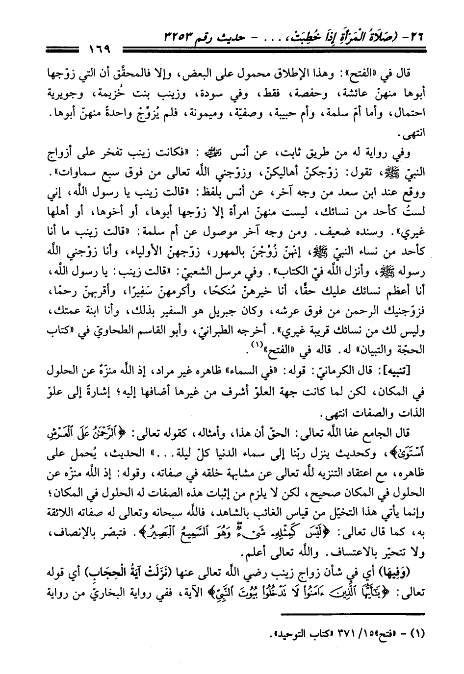 وفي رواية له من طريق ثابت، عن أنس - رضي اللَّه عنه -: "فكانت زينب تفخر على أزواج النبيّ - صلى اللَّه عليه وسلم -، تقول: زوّجكنّ أهاليكنّ، وزوّجني اللَّه تعالى من فوق سبع سماوات". ووقع عند ابن سعد من وجه آخر، عن أنس بلفظ: "قالت زينب يا رسول اللَّه، إني لستُ كأحد من نسائك، ليست منهنّ امرأة إلا زوّجها أبوها، أو أخوها، أو أهلها غيري". وسنده ضعيف. ومن وجه آخر موصول عن أم سلمة: "قالت زينب ما أنا كأحد من نساء النبيّ - صلى اللَّه عليه وسلم -، إنّهنّ زُوّجْنّ بالمهور، زوّجهنّ الأولياء، وأنا زوَّجني اللَّه رسوله - صلى اللَّه عليه وسلم -، وأنزل اللَّه في الكتاب". وفي مرسل الشعبيّ: "قالت زينب: يا رسول اللَّه، أنا أعظم نسائك عليك حقًّا، أنا خيرهنّ مُنكحًا، وأكرمهنّ سَفِيرًا، وأقربهنّ رحمًا، فزوّجنيك الرحمن من فوق عرشه، وكان جبريل هو السفير بذلك، وأنا ابنة عمتك، وليس لك من نسائك قريبة غيري". أخرجه الطبرانيّ، وأبو القاسم الطحاويّ في "كتاب الحجّة والتبيان" له. قاله في "الفتح" (¬1).