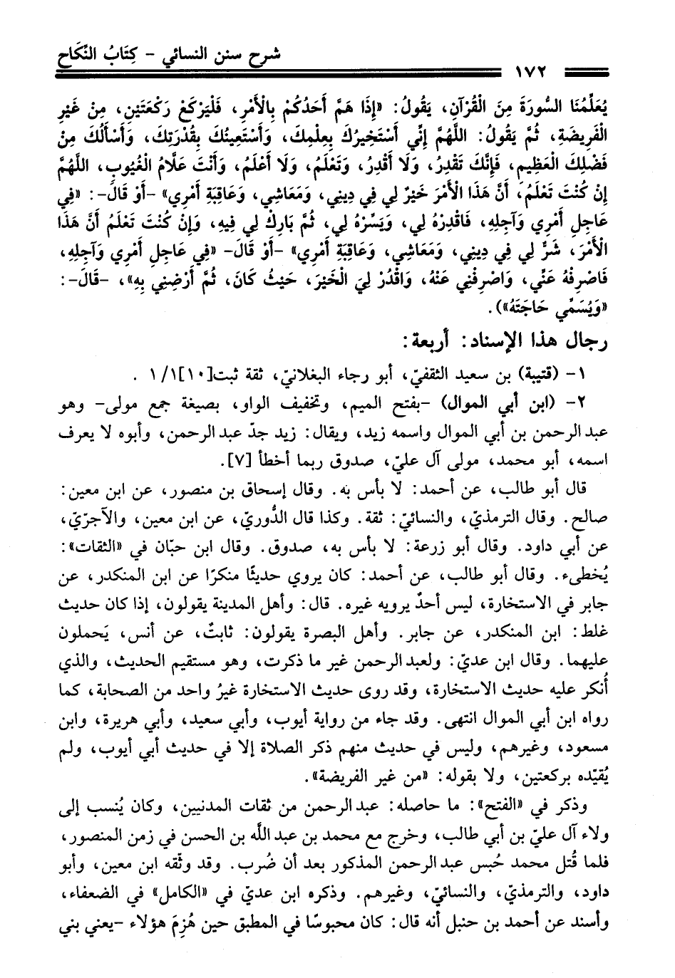 قال أبو طالب، عن أحمد: لا بأس بة. وقال إسحاق بن منصور، عن ابن معين: صالح. وقال الترمذيّ، والنسائيّ: ثقة. وكذا قال الدُّوريّ، عن ابن معين، والآجرّيّ، عن أبي داود. وقال أبو زرعة: لا بأس به، صدوق. وقال ابن حبّان في "الثقات": يُخطىء. وقال أبو طالب، عن أحمد: كان يروي حديثًا منكرًا عن ابن المنكدر، عن جابر في الاستخارة، ليس أحدٌ يرويه غيره. قال: وأهل المدينة يقولون، إذا كان حديث غلط: ابن المنكدر، عن جابر. وأهل البصرة يقولون: ثابتٌ، عن أنس، يَحملون عليهما. وقال ابن عديّ: ولعبد الرحمن غير ما ذكرت، وهو مستقيم الحديث، والذي أُنكر عليه حديث الاستخارة، وقد روى حديث الاستخارة غيرُ واحد من الصحابة، كما رواه ابن أبي الموال انتهى. وقد جاء من رواية أيوب، وأبي سعيد، وأبي هريرة، وابن مسعود، وغيرهم، وليس في حديث منهم ذكر الصلاة إلا في حديث أبي أيوب، ولم يُقيّده بركعتين، ولا بقوله: "من غير الفريضة".