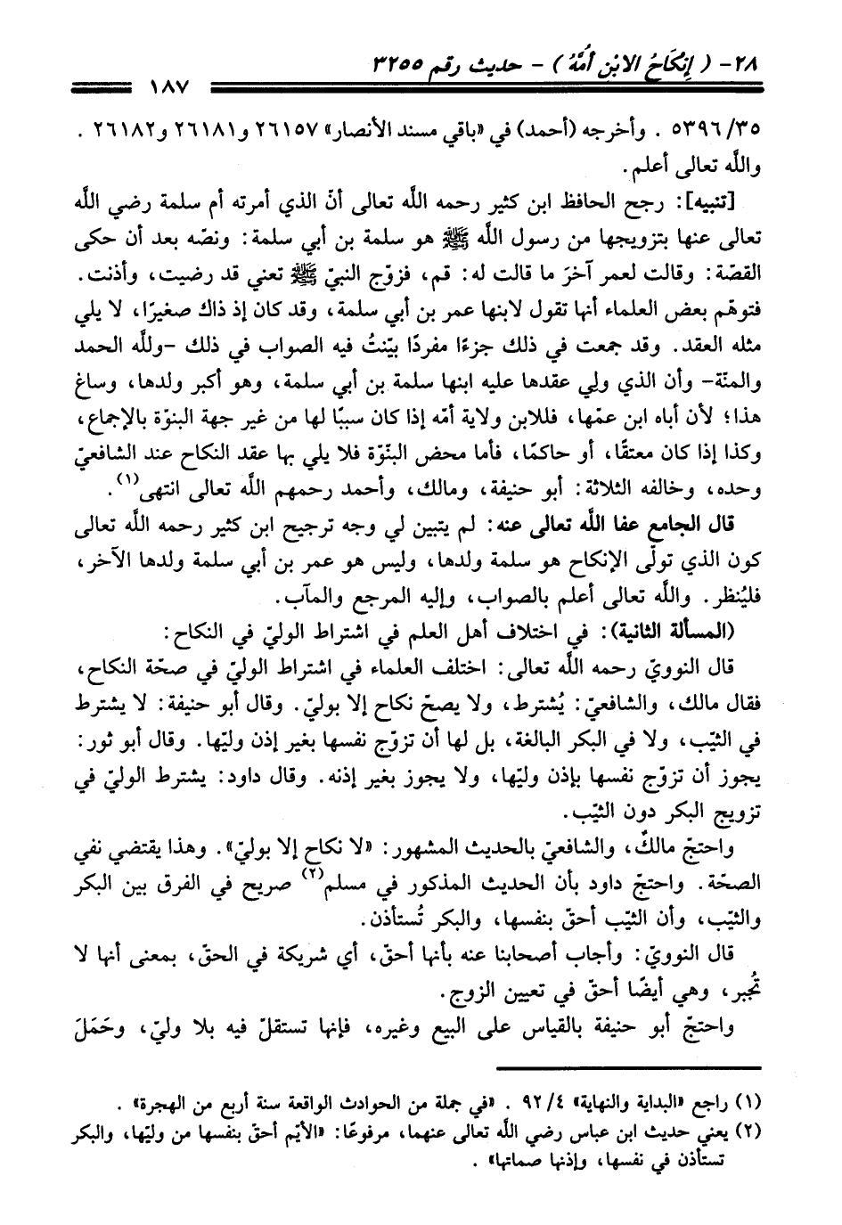 قال الجامع - عفا اللَّه تعالى عنه -: لم يتبين لي وجه ترجيح ابن كثير -رحمه اللَّه تعالى- كون الذي تولى الإنكاح هو سلمة ولدها، وليس هو عمر بن أبي سلمة ولدها الآخر، فليُنظر. واللَّه تعالى أعلم بالصواب، وإليه المرجع والمآب.
