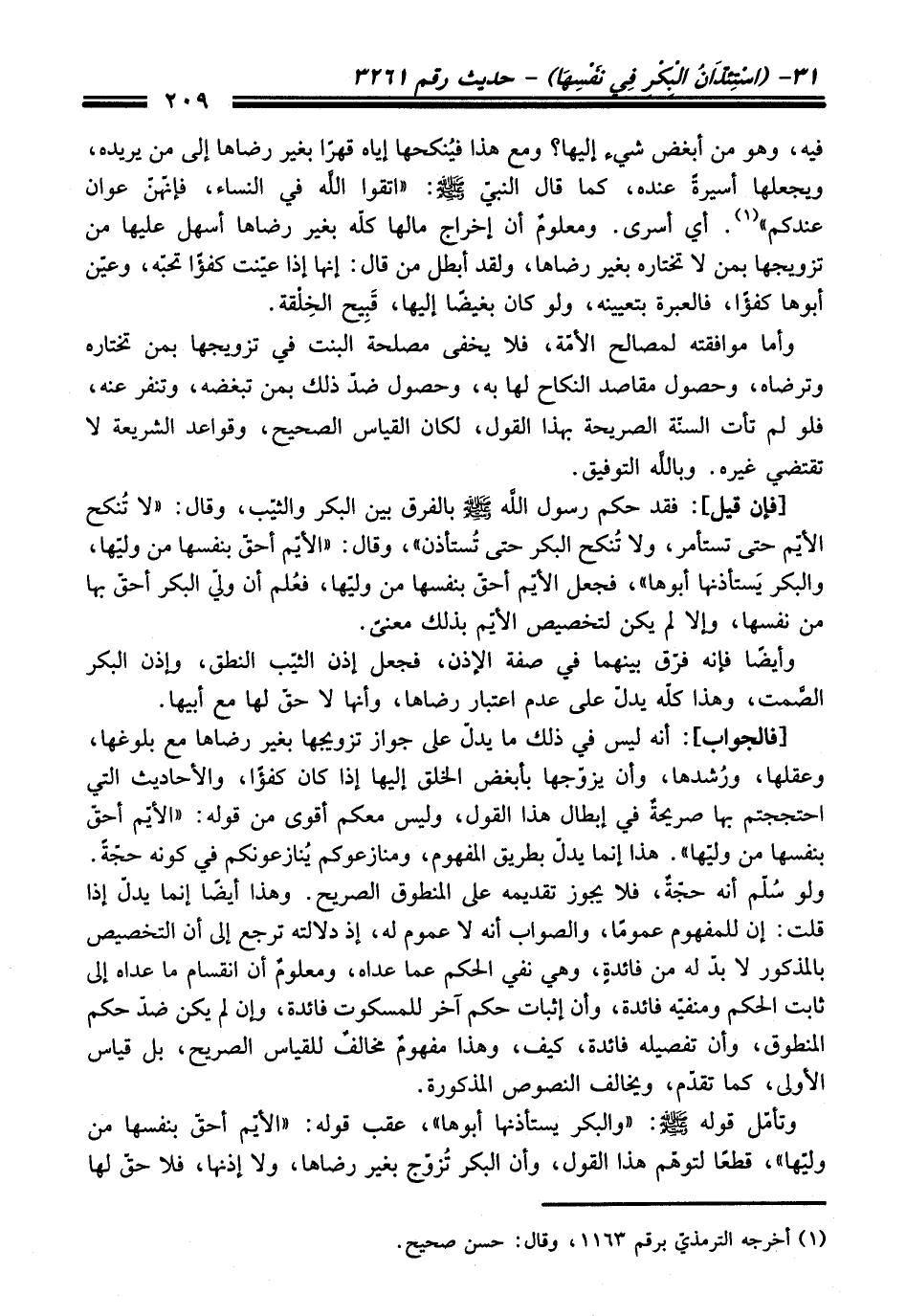 [فالجواب]: أنه ليس في ذلك ما يدلّ على جواز تزويجها بغير رضاها مع بلوغها، وعقلها، ورُشدها، وأن يزوّجها بأبغض الخلق إليها إذا كان كفؤًا، والأحاديث التي احتججتم بها صريحةٌ في إبطال هذا القول، وليس معكم أقوى من قوله: "الأيّم أحقّ بنفسها من وليّها". هذا إنما يدلّ بطريق المفهوم، ومنازعوكم يُنازعونكم في كونه حجّةٌ. ولو سُلّم أنه حجّةٌ، فلا يجوز تقديمه على المنطوق الصريح. وهذا أيضًا إنما يدلّ إذا قلت: إن للمفهوم عمومًا، والصواب أنه لا عموم له، إذ دلالته ترجع إلى أن التخصيص بالمذكور لا بدّ له من فائدةٍ، وهي نفي الحكم عما عداه، ومعلومٌ أن انقسام ما عداه إلى ثابت الحكم ومنفيّه فائدة، وأن إثبات حكم آخر للمسكوت فائدة، وإن لم يكن ضدّ حكم المنطوق، وأن تفصيله فائدة، كيف، وهذا مفهومٌ مخالفٌ للقياس الصريح، بل قياس الأولى، كما تقدّم، ويخالف النصوص المذكورة.