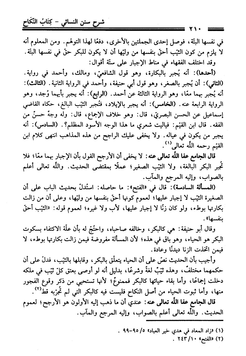 (الثاني): أن يُجبر بالصغر، وهو قول أبي حنيفة، وأحمد في الرواية الثانية. (الثالث): أنه يُجبر بهما معًا، وهو الرواية الثالثة عن أحمد. (الرابع): أنه يجبر بأيهما وُجد، وهو الرواية الرابعة عنه. (الخامس): أنه يجبر بالإيلاد، فتُجبر الثيّب البالغ، حكاه القاضي إسماعيل عن الحسن البصريّ، قال: وهو خلاف الإجماع، قال: وله وجهٌ حسنٌ من الفقه. قال ابن القيّم: فيا ليت شعري ما هذا الوجه الأسود المظلم؟. (السادس): أنه يجبر من يكون في عياله. ولا يخفى عليك الراجح من هذه المذاهب انتهى كلام ابن القيّم -رحمه اللَّه تعالى- (¬1).
