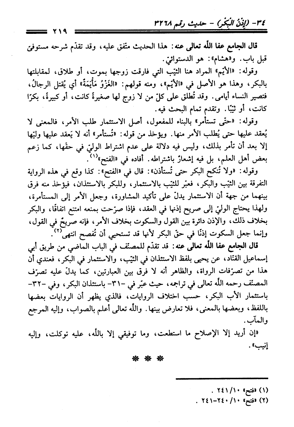 قال الجامع - عفا اللَّه تعالى عنه -: قد تقدّم للمصنّف في الباب الماضي من طريق أبي إسماعيل القنّاد، عن يحيى بلفظ الاستئذان في الثيّب، والاستئمار في البكر، فعندي أن هذا من تصرّفات الرواة، والظاهر أنه لا فرق بين العبارتين، كما يدلّ عليه تصرّف المصنّف -رحمه اللَّه تعالى- في تراجمه، حيث عبّر في -31 - باستئذان البكر، وفي -32 - باستئمار الأب البكر، حسب اختلاف الروايات، فالذي يظهر أن الروايات بعضها باللفظ، وبعضها بالمعنى، فلا تعارض بينها. واللَّه تعالى أعلم بالصواب، وإليه المرجع والمآب.