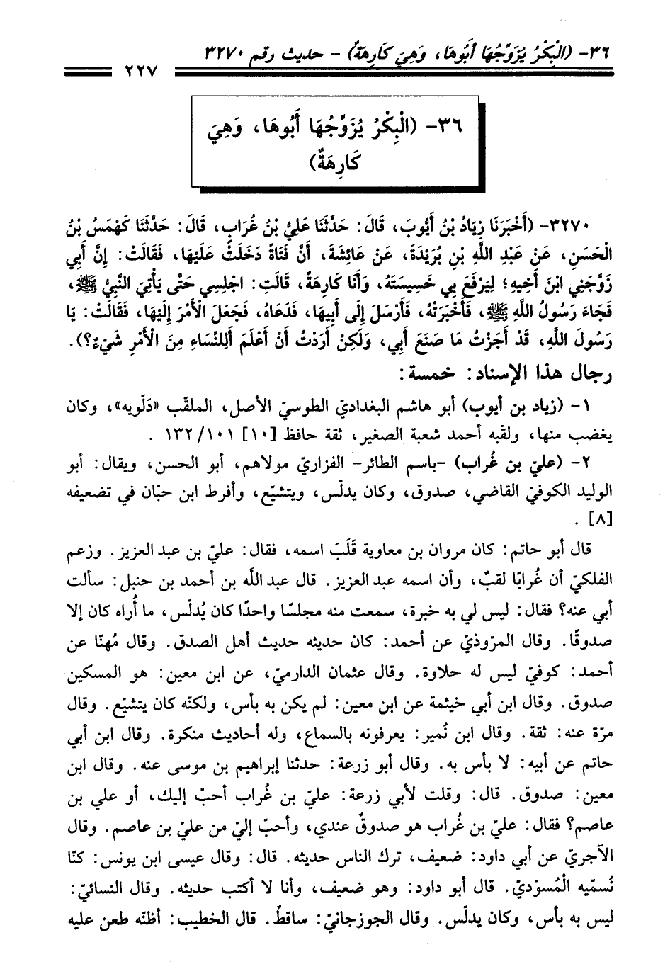 3270 - (أَخْبَرَنَا زِيَادُ بْنُ أَيُّوبَ, قَالَ: حَدَّثَنَا عَلِيُّ بْنُ غُرَابٍ, قَالَ: حَدَّثَنَا كَهْمَسُ بْنُ الْحَسَنِ, عَنْ عَبْدِ اللَّهِ بْنِ بُرَيْدَةَ, عَنْ عَائِشَةَ, أَنَّ فَتَاةً دَخَلَتْ عَلَيْهَا, فَقَالَتْ: إِنَّ أَبِي زَوَّجَنِي ابْنَ أَخِيهِ؛ لِيَرْفَعَ بِي خَسِيسَتَهُ, وَأَنَا كَارِهَةٌ, قَالَتِ اجْلِسِي حَتَّى يَأْتِيَ النَّبِيُّ - صلى اللَّه عليه وسلم -, فَجَاءَ رَسُولُ اللهِ - صلى اللَّه عليه وسلم -, فَأَخْبَرَتْهُ, فَأَرْسَلَ إِلَى أَبِيهَا, فَدَعَاهُ, فَجَعَلَ الأَمْرَ إِلَيْهَا, فَقَالَتْ: يَا رَسُولَ اللهِ, قَدْ أَجَزْتُ مَا صَنَعَ أَبِي, وَلَكِنْ أَرَدْتُ أَنْ أَعْلَمَ أَلِلنِّسَاءِ مِنَ الأَمْرِ شَيْءٌ؟)