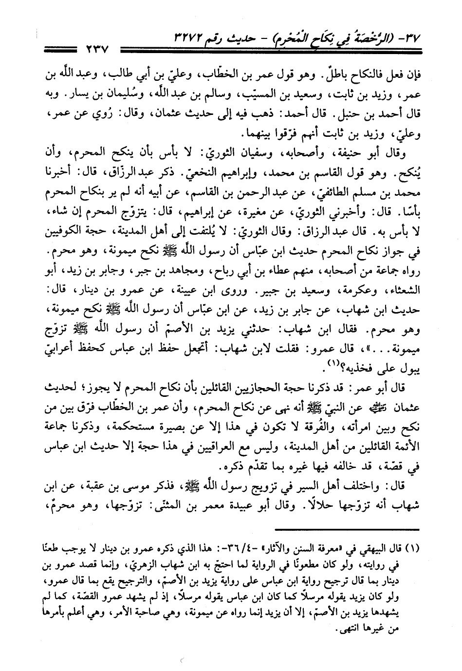 (¬1) قال البيهقي في "معرفة السنن والآثار" -4/ 36 - : هذا الذي ذكره عمرو بن دينار لا يوجب طعنًا في روايته، ولو كان مطعونًا في الرواية لما احتجّ به ابن شهاب الزهريّ، وإنما قصد عمرو بن دينار بما قال ترجيح رواية ابن عباس على رواية يزيد بن الأصمّ، والترجيح يقع بما قال عمرو، ولو كان يزيد يقوله مرسلًا كما كان ابن عباس يقوله مرسلًا، إذ لم يشهد عمرو القصّة، كما لم يشهدها يزيد بن الأصمّ، إلا أن يزيد إنما رواه عن ميمونة، وهي صاحبة الأمر، وهي أعلم بأمرها من غيرها انتهى.