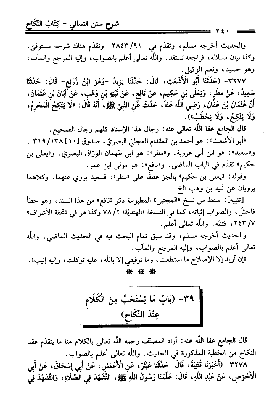 قال الجامع - عفا اللَّه عنه -: أراد المصنّف -رحمه اللَّه تعالى- بالكلام هنا ما يتقدّم عقد النكاح من الخطبة المذكورة في الحديث. واللَّه تعالى أعلم بالصواب.