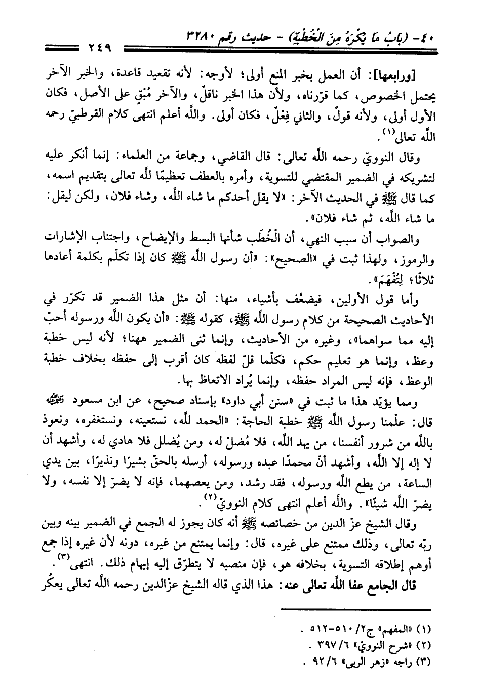 ومما يؤيّد هذا ما ثبت في "سنن أبي داود" بإسناد صحيح، عن ابن مسعود - رضي اللَّه عنه - قال: علّمنا رسول اللَّه - صلى اللَّه عليه وسلم - خطبة الحاجة: "الحمد للَّه، نستعينه، ونستغفره، ونعوذ باللَّه من شرور أنفسنا، من يهد اللَّه، فلا مُضلّ له، ومن يُضلل فلا هادي له، وأشهد أن لا إله إلا اللَّه، وأشهد أن محمدًا عبده ورسوله، أرسله بالحق بشيرًا ونذيرًا، بين يدي الساعة، من يطع اللَّه ورسوله، فقد رشد، ومن يعصهما، فإنه لا يضرّ إلا نفسه، ولا يضرّ اللَّه شيئًا". واللَّه أعلم انتهى كلام النوويّ (¬2).