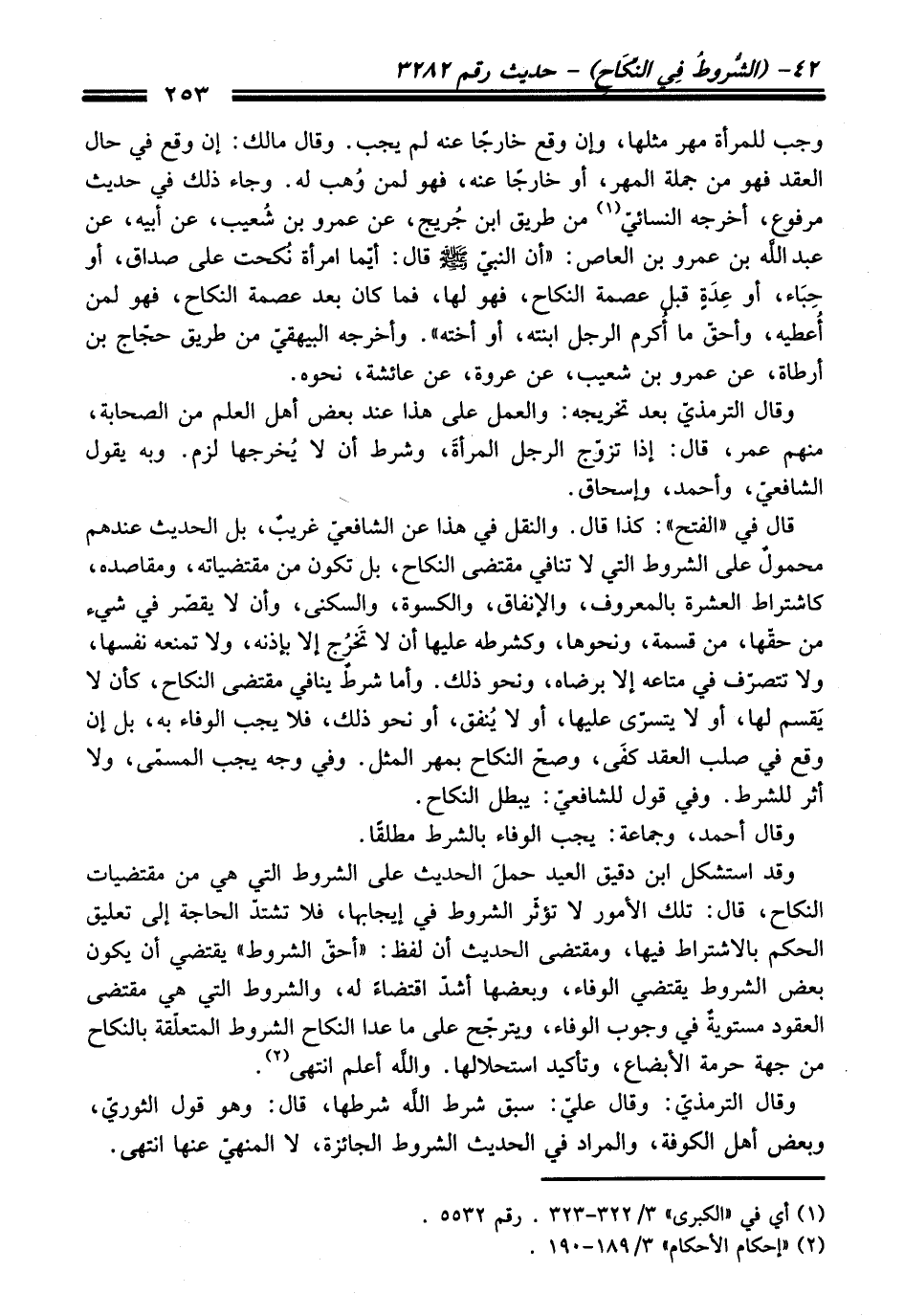 وقد استشكل ابن دقيق العيد حملَ الحديث على الشروط التي هي من مقتضيات النكاح، قال: تلك الأمور لا تؤثّر الشروط في إيجابها، فلا تشتدّ الحاجة إلى تعليق الحكم بالاشتراط فيها، ومقتضى الحديث أن لفظ: "أحقّ الشروط" يقتضي أن يكون بعض الشروط يقتضي الوفاء، وبعضها أشدّ اقتضاءً له، والشروط التي هي مقتضى العقود مستويةٌ في وجوب الوفاء، ويترجّح على ما عدا النكاح الشروط المتعلّقة بالنكاح من جهة حرمة الأبضاع، وتأكيد استحلالها. واللَّه أعلم انتهى (¬2).