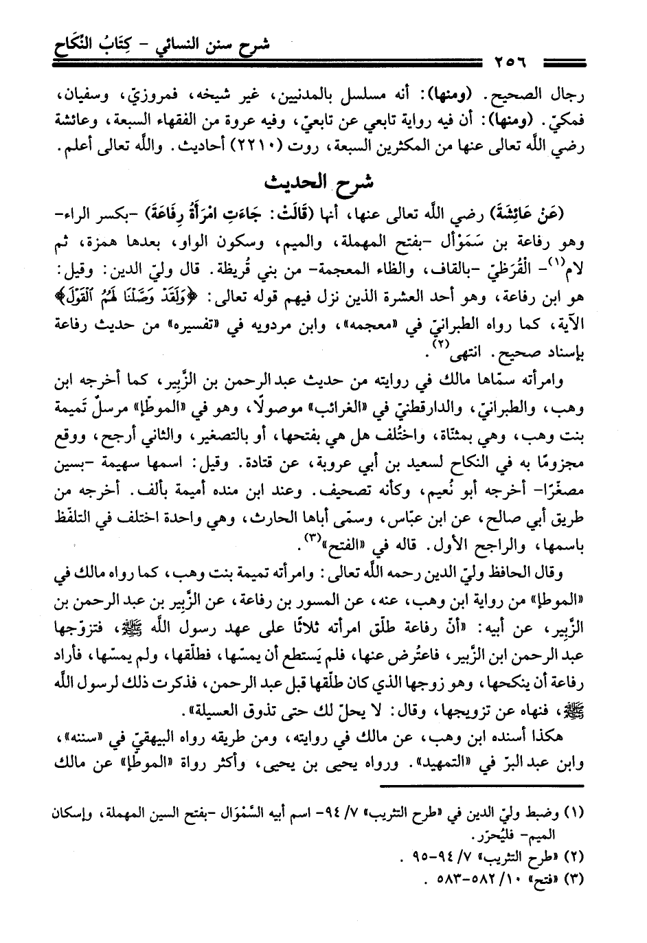 وقال الحافظ وليّ الدين -رحمه اللَّه تعالى-: وامرأته تميمة بنت وهب، كما رواه مالك في "الموطإ" من رواية ابن وهب، عنه، عن المسور بن رفاعة، عن الزَّبِير بن عبد الرحمن بن الزَّبِير، عن أبيه: "أنّ رفاعة طلّق امرأته ثلاثًا على عهد رسول اللَّه - صلى اللَّه عليه وسلم -، فتزوّجها عبد الرحمن ابن الزَّبير، فاعتُرض عنها، فلم يَستطع أن يمسّها، فطلّقها، ولم يمسّها، فأراد رفاعة أن ينكحها، وهو زوجها الذي كان طلّقها قبل عبد الرحمن، فذكرت ذلك لرسول اللَّه - صلى اللَّه عليه وسلم -، فنهاه عن تزويجها، وقال: لا يحلّ لك حتى تذوق العسيلة".