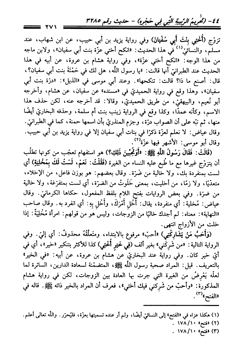 تزوّج (أُخْتِي بِنْتَ أَبِي سُفْيَانَ) وفي رواية يزيد بن أبي حبيب، عن ابن شهاب، عند مسلم، والنسائيّ (¬1) في هذا الحديث: "انكح أختي عزة بنت أبي سفيان"، ولابن ماجه من هذا الوجه: "انكح أختي عزّة"، وفي رواية هشام بن عروة، عن أبيه في هذا الحديث عند الطبرانيّ أنها قالت: "يا رسول اللَّه، هل لك في حَمْنَةَ بنت أبي سفيان؟، قال: أصنع ماذا؟ قالت: تنكحها". وعند أبي موسى في "الذيل": "درّة بنت أبي سفيان"، وهذا وقع في رواية الحميديّ في "مسنده" عن سفيان، عن هشام، وأخرجه أبو نُعيم، والبيهقيّ، من طريق الحميديّ، وقالا: قد أخرجه عنه، لكن حذف هذا الاسم، وكأنه عمدًا، وكذا وقع في الرواية زينب بنت أم سلمة، وحذفه البخاريّ أيضًا منها، ثم نبّه على أن الصواب درّة، وجزم المنذريّ بأن اسمها حمنة، كما في الطبرانيّ. وقال عياض: لا نعلم لعزّة ذكرًا في بنات أبي سفيان إلا في رواية يزيد بن أبي حبيب. وقال أبو موسى: الأشهر فيها عزّة (¬2).