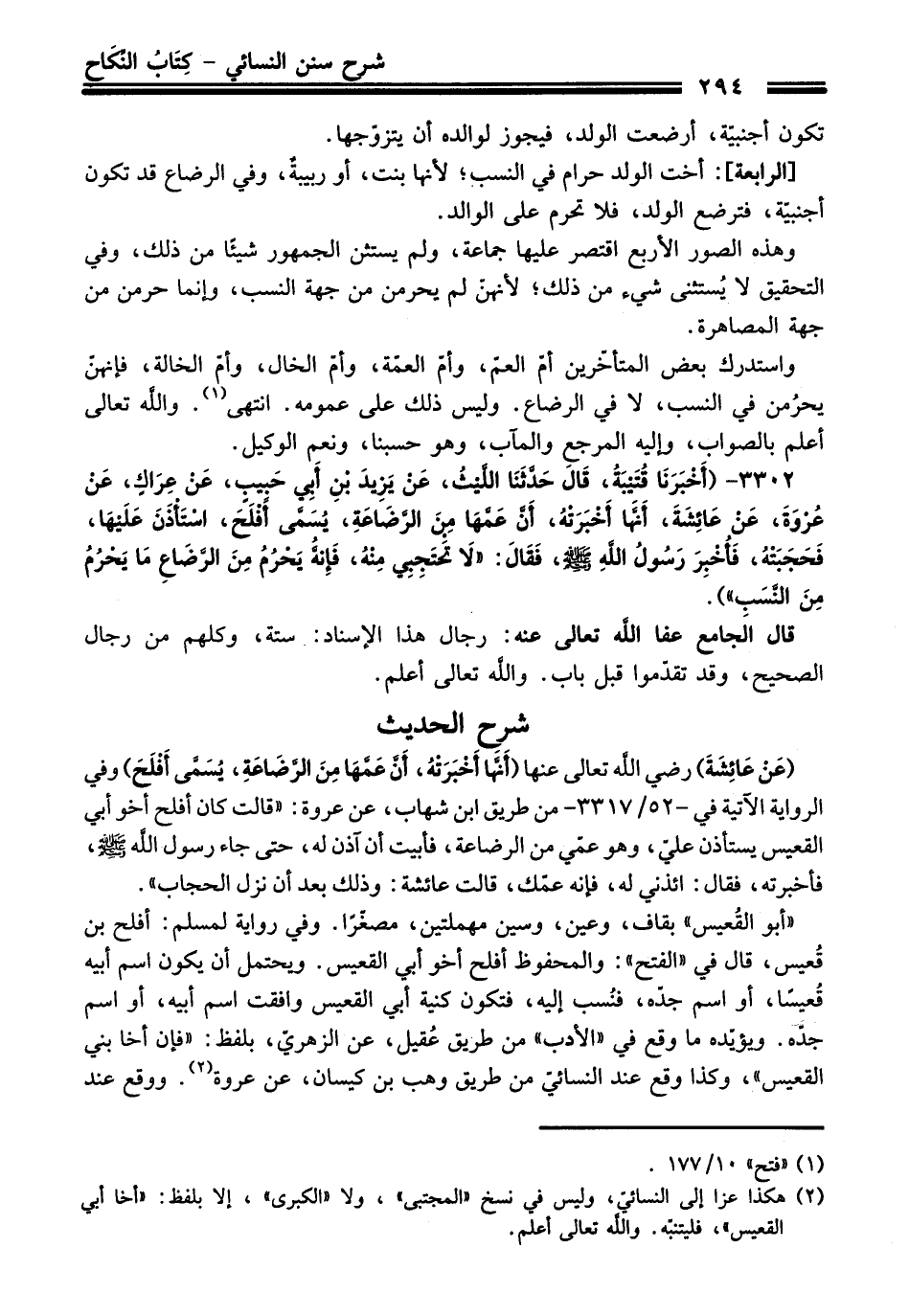 3302 - (أَخْبَرَنَا قُتَيْبَةُ, قَالَ: حَدَّثَنَا اللَّيْثُ, عَنْ يَزِيدَ بْنِ أَبِي حَبِيبٍ, عَنْ عِرَاكٍ, عَنْ عُرْوَةَ, عَنْ عَائِشَةَ, أَنَّهَا أَخْبَرَتْهُ, أَنَّ عَمَّهَا مِنَ الرَّضَاعَةِ, يُسَمَّى أَفْلَحَ, اسْتَأْذَنَ عَلَيْهَا, فَحَجَبَتْهُ, فَأُخْبِرَ رَسُولُ اللهِ - صلى اللَّه عليه وسلم -, فَقَالَ: «لاَ تَحْتَجِبِي مِنْهُ, فَإِنَّهُ يَحْرُمُ مِنَ الرَّضَاعِ مَا يَحْرُمُ مِنَ النَّسَبِ»).