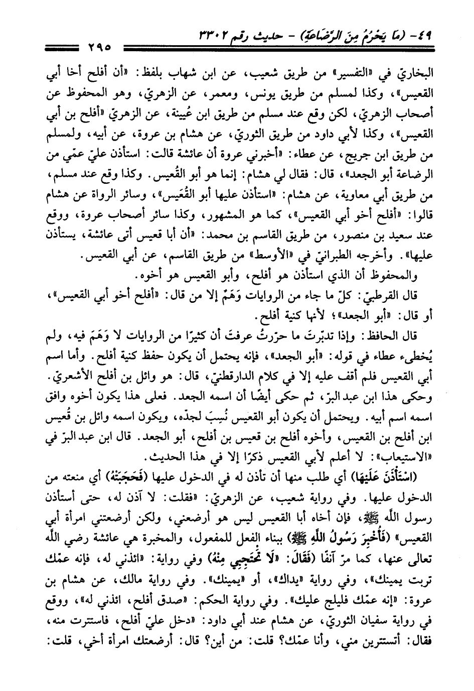 البخاريّ في "التفسير" من طريق شعيب، عن ابن شهاب بلفظ: "أن أفلح أخا أبي القعيس"، وكذا لمسلم من طريق يونس، ومعمر، عن الزهريّ، وهو المحفوظ عن أصحاب الزهريّ، لكن وقع عند مسلم من طريق ابن عُيينة، عن الزهريّ "أفلح بن أبي القعيس"، وكذا لأبي داود من طريق الثوريّ، عن هشام بن عروة، عن أبيه، ولمسلم من طريق ابن جريج، عن عطاء: "أخبرني عروة أن عائشة قالت: استأذن عليّ عمّي من الرضاعة أبو الجعد"، قال: فقال لي هشام: إنما هو أبو القُعيس. وكذا وقع عند مسلم، من طريق أبي معاوية، عن هشام: "استأذن عليها أبو القُعَيس"، وسائر الرواة عن هشام قالوا: "أفلح أخو أبي القعيس"، كما هو المشهور، وكذا سائر أصحاب عروة، ووقع عند سعيد بن منصور، من طريق القاسم بن محمد: "أن أبا قعيس أتى عائشة، يستأذن عليها". وأخرجه الطبرانيّ في "الأوسط" من طريق القاسم، عن أبي القعيس.