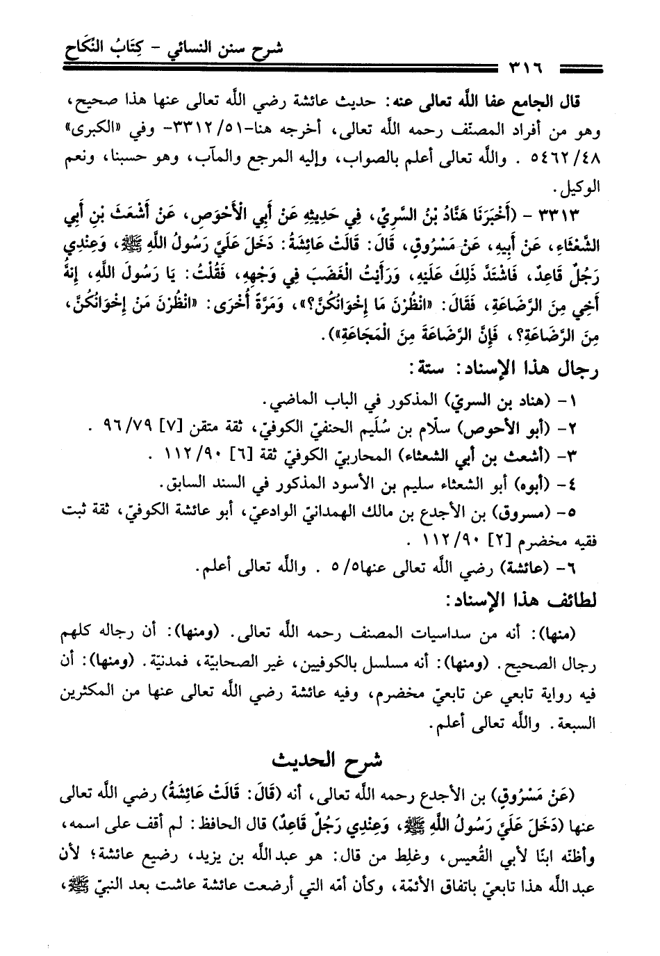 3313 - (أَخْبَرَنَا هَنَّادُ بْنُ السَّرِيِّ, فِي حَدِيثِهِ عَنْ أَبِي الأَحْوَصِ, عَنْ أَشْعَثَ بْنِ أَبِي الشَّعْثَاءِ, عَنْ أَبِيهِ, عَنْ مَسْرُوقٍ, قَالَ: قَالَتْ عَائِشَةُ: دَخَلَ عَلَيَّ رَسُولُ اللهِ - صلى اللَّه عليه وسلم -, وَعِنْدِي رَجُلٌ قَاعِدٌ, فَاشْتَدَّ ذَلِكَ عَلَيْهِ, وَرَأَيْتُ الْغَضَبَ فِي وَجْهِهِ, فَقُلْتُ: يَا رَسُولَ اللهِ, إِنَّهُ أَخِي مِنَ الرَّضَاعَةِ, فَقَالَ: «انْظُرْنَ مَا إِخْوَانُكُنَّ؟ ", وَمَرَّةً أُخْرَى: "انْظُرْنَ مَنْ إِخْوَانُكُنَّ, مِنَ الرَّضَاعَةِ؟ , فَإِنَّ الرَّضَاعَةَ مِنَ الْمَجَاعَةِ").