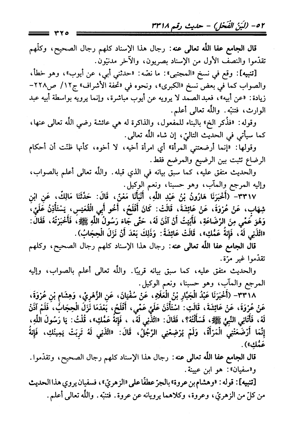 3318 - (أَخْبَرَنَا عَبْدُ الْجَبَّارِ بْنُ الْعَلاَءِ, عَنْ سُفْيَانَ, عَنِ الزُّهْرِيِّ, وَهِشَامِ بْنِ عُرْوَةَ, عَنْ عُرْوَةَ, عَنْ عَائِشَةَ, قَالَتِ: اسْتَأْذَنَ عَلَيَّ عَمِّي, أَفْلَحُ, بَعْدَ مَا نَزَلَ الْحِجَابُ, فَلَمْ آذَنْ لَهُ, فَأَتَانِي النَّبِيُّ - صلى اللَّه عليه وسلم -, فَسَأَلْتُهُ؟ , فَقَالَ: «ائْذَنِي لَهُ, , فَإِنَّهُ عَمُّكِ» , قُلْتُ: يَا رَسُولَ اللهِ, إِنَّمَا أَرْضَعَتْنِي الْمَرْأَةُ, وَلَمْ يُرْضِعْنِي الرَّجُلُ, قَالَ: «ائْذَنِي لَهُ تَرِبَتْ يَمِينُكِ, فَإِنَّهُ عَمُّكِ»).