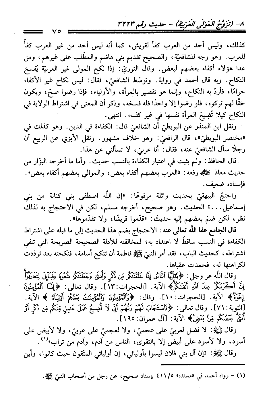 قال الجامع - عفا اللَّه تعالى عنه -: الاحتجاج بضم هذا الحديث إلى ما قبله على اشتراط الكفاءة في النسب ساقطٌ لا اعتداد به؛ لمخالفته للأدلة الصحيحة الصريحة التي تنفي اشتراطه، كحديث الباب، فقد أمر النبيّ - صلى اللَّه عليه وسلم - فاطمة أن تنكح أسامة، فنكحته بعد تردّدت لكراهتها له، فحمدت عقباها.