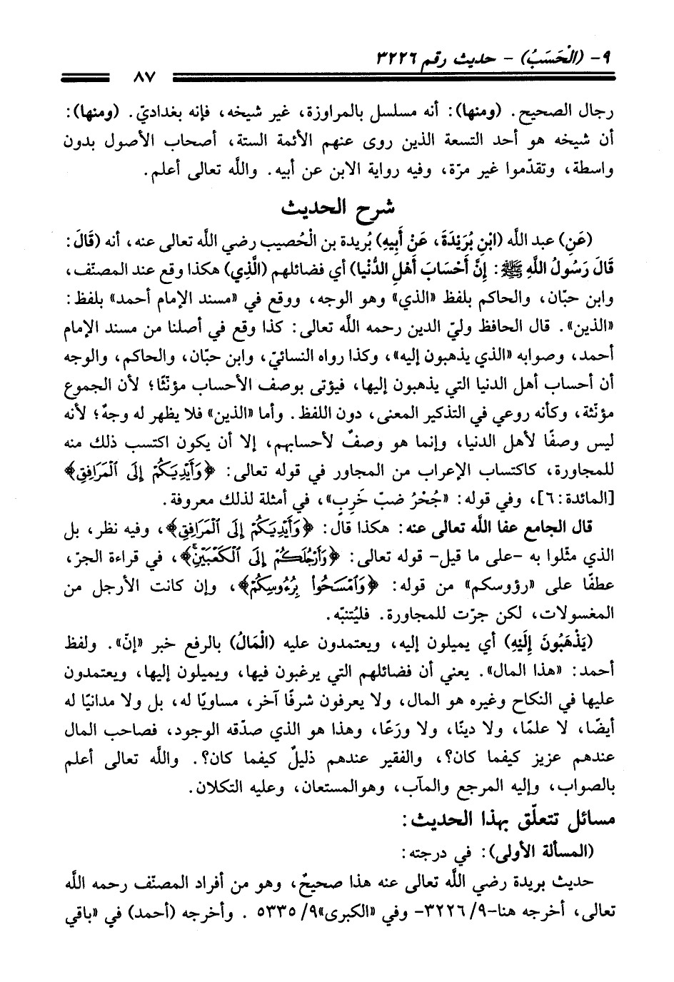 حديث بريدة - رضي اللَّه تعالى عنه - هذا صحيحٌ، وهو من أفراد المصنّف -رَحِمَهُ اللَّهُ تَعَالَي-، أخرجه هنا-9/ 3226 - وفي "الكبرى" 9/ 5335. وأخرجه (أحمد) في "باقي
